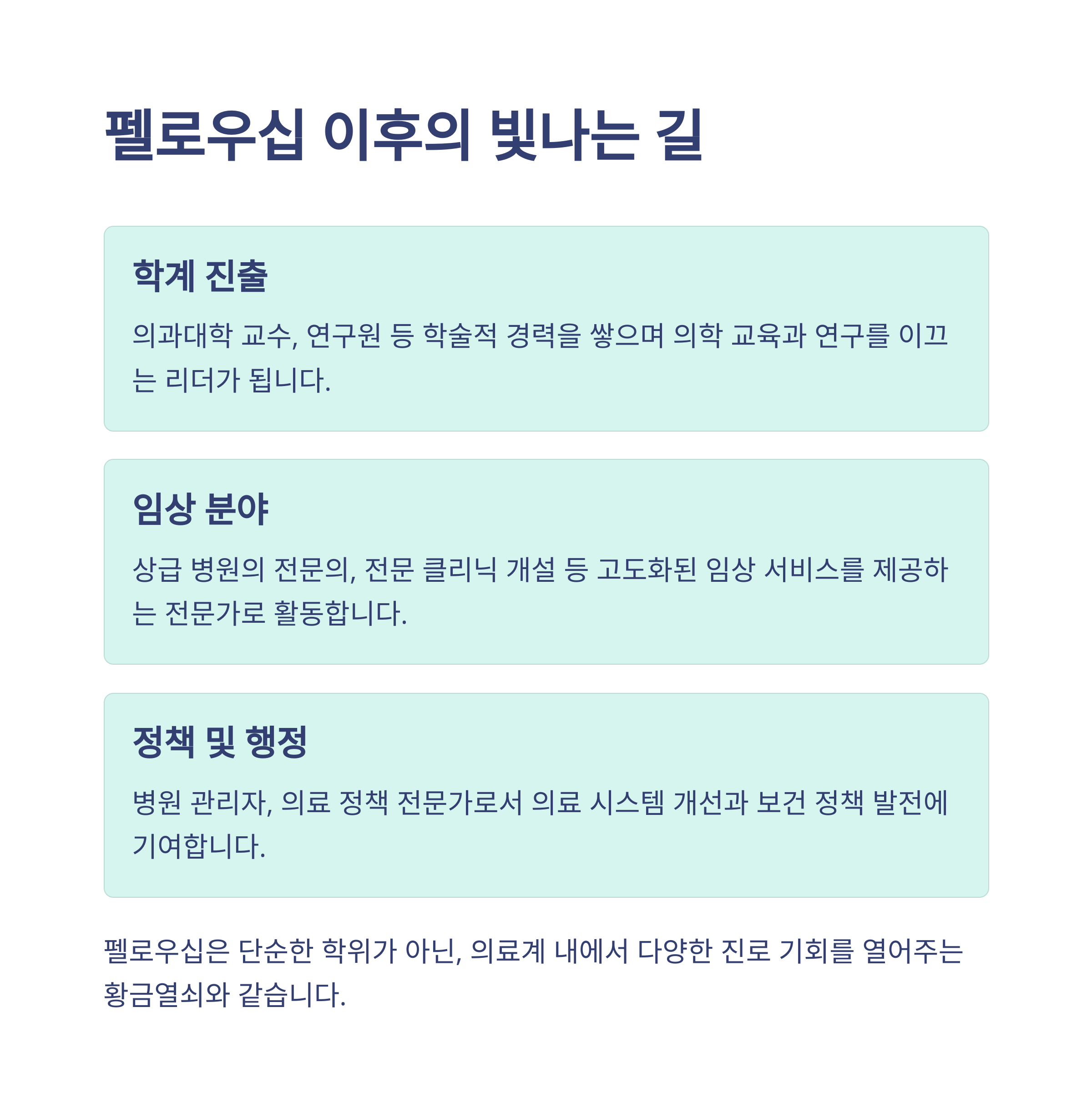 | 펠로우 과정을 마친 후, 의사들은 병원 내 다양한 직책을 선택할 수 있습니다. 교수직을 선택하여 의료 교육과 연구를 병행하는 경우도 많습니다. 병원의 전문 센터나 특정 임상의 리더로 활동할 수 있는 기회도 열려 있습니다. 국제 병원이나 연구소에서 경력을 살려 글로벌 전문가로도 일할 수 있습니다. 또한 개인병원을 열어 해당 세부 전공 분야를 바탕으로 독립적으로 활동하는 경우도 있습니다. |