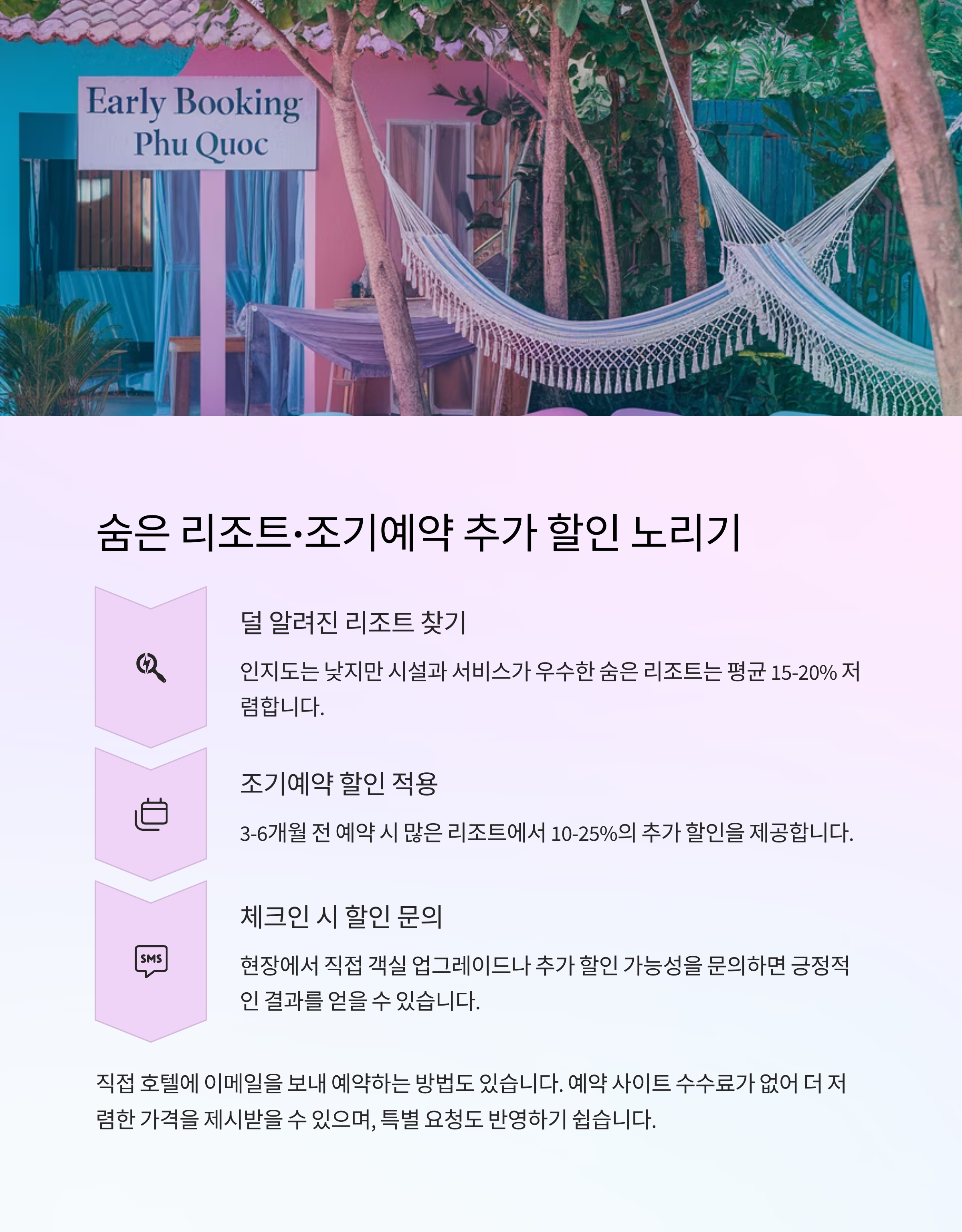 리조트 프로모션과 비수기를 활용해 추가 할인을 누릴 수 있습니다.