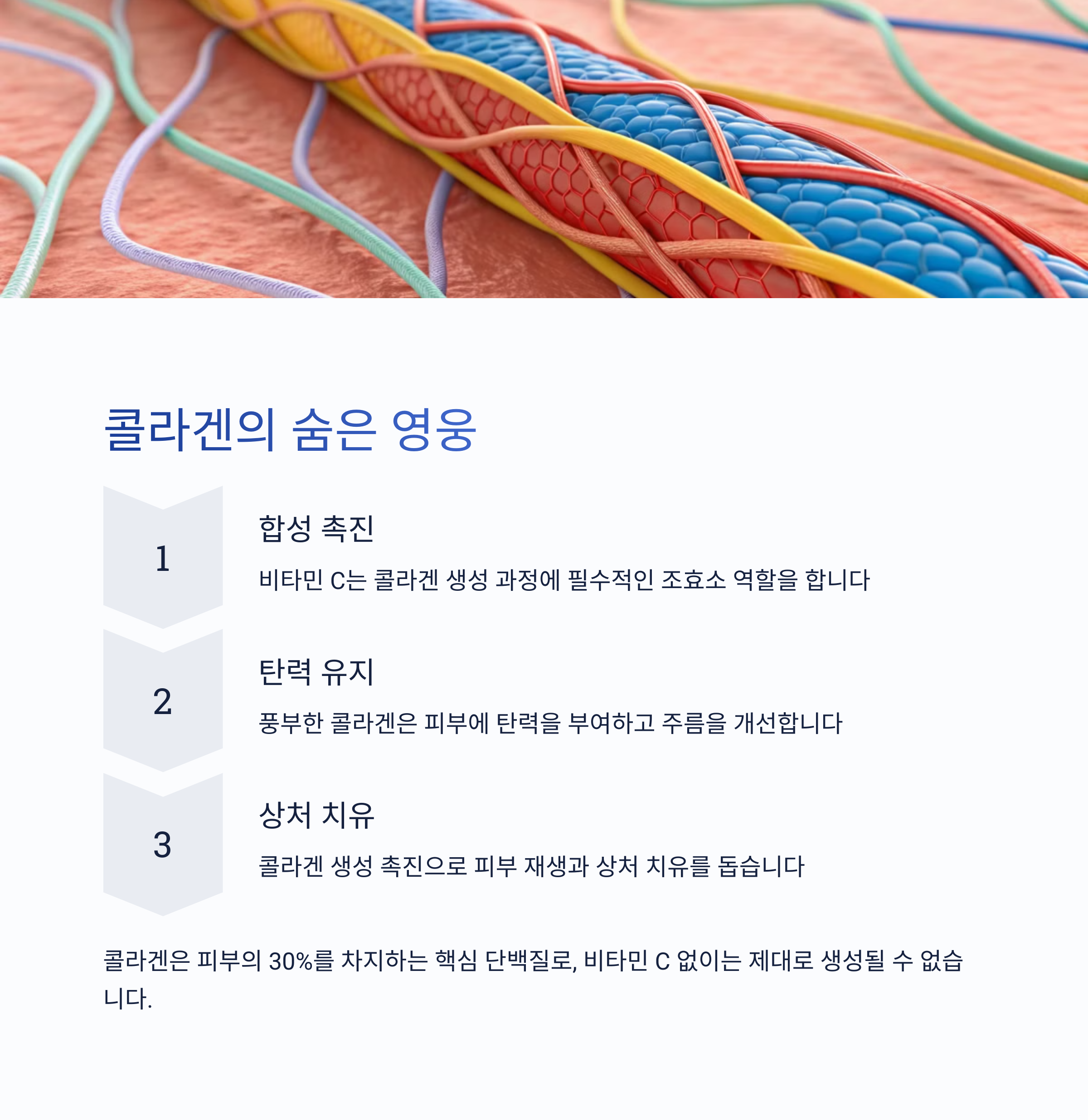 피부 탄력을 유지하는 핵심 단백질인 콜라겐의 합성에도 비타민 C는 빠질 수 없습니다. 비타민 C는 콜라겐 형성에 필요한 효소의 작용을 활성화시켜 피부 속 진피층을 탄탄하게 만듭니다. 콜라겐이 충분하면 피부가 탱탱하고 매끄러운 상태를 유지할 수 있으며, 주름과 처짐을 예방하는 데도 효과적입니다. 또한 뼈, 관절, 연골 조직의 건강에도 필수적이므로 전신 건강을 위한 필수 영양소라 할 수 있습니다.