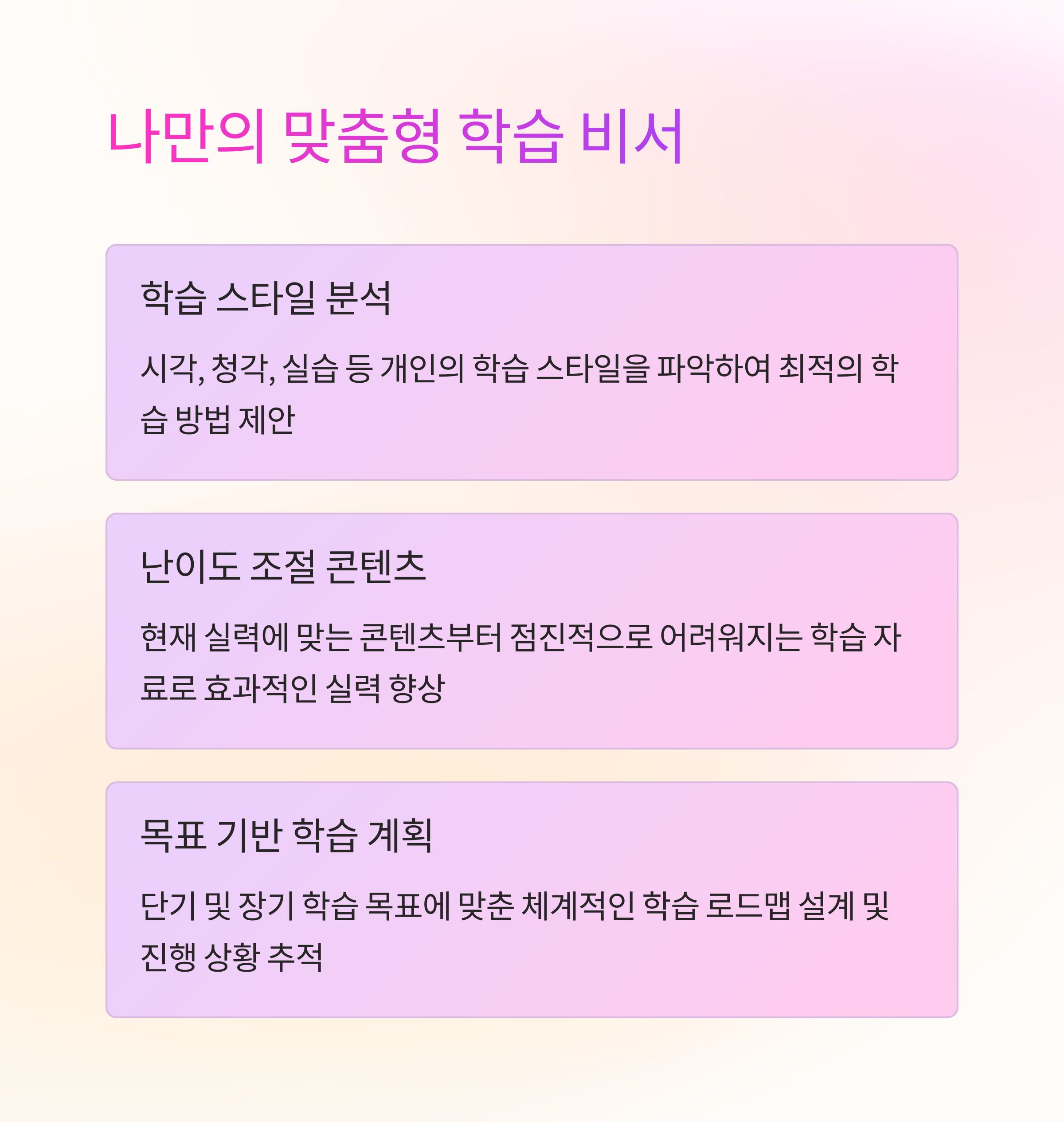 학습 효율을 극대화하고 목표를 성취하는 데 도움을 드리겠습니다.