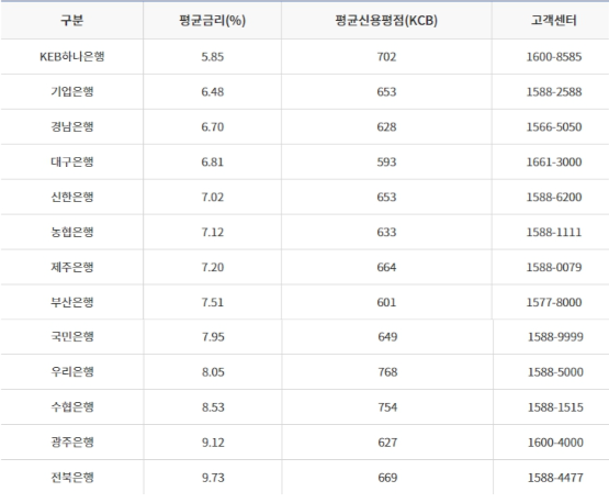 대출금리는 은행별 이용자 신용 및 부채 규모에 따라 상이하며 신용평점별 은행금리는 다음과 같다.