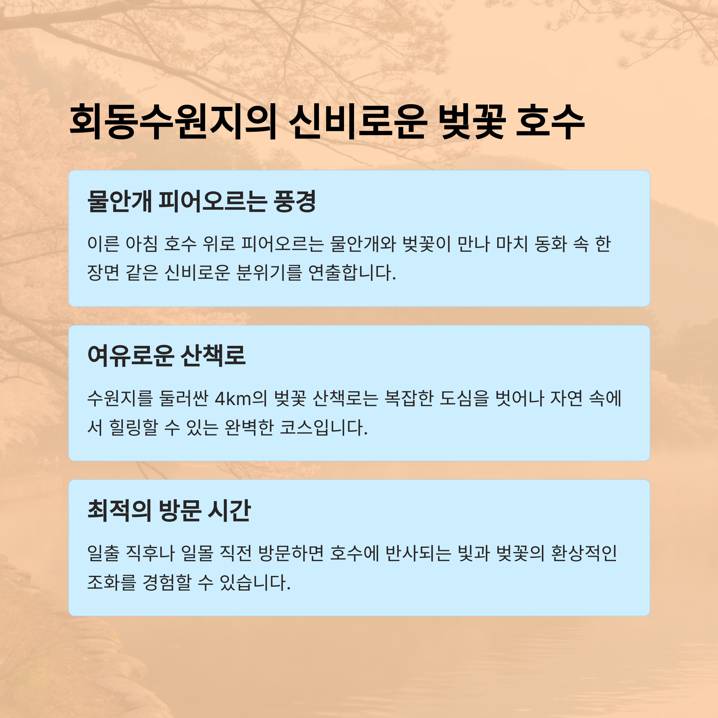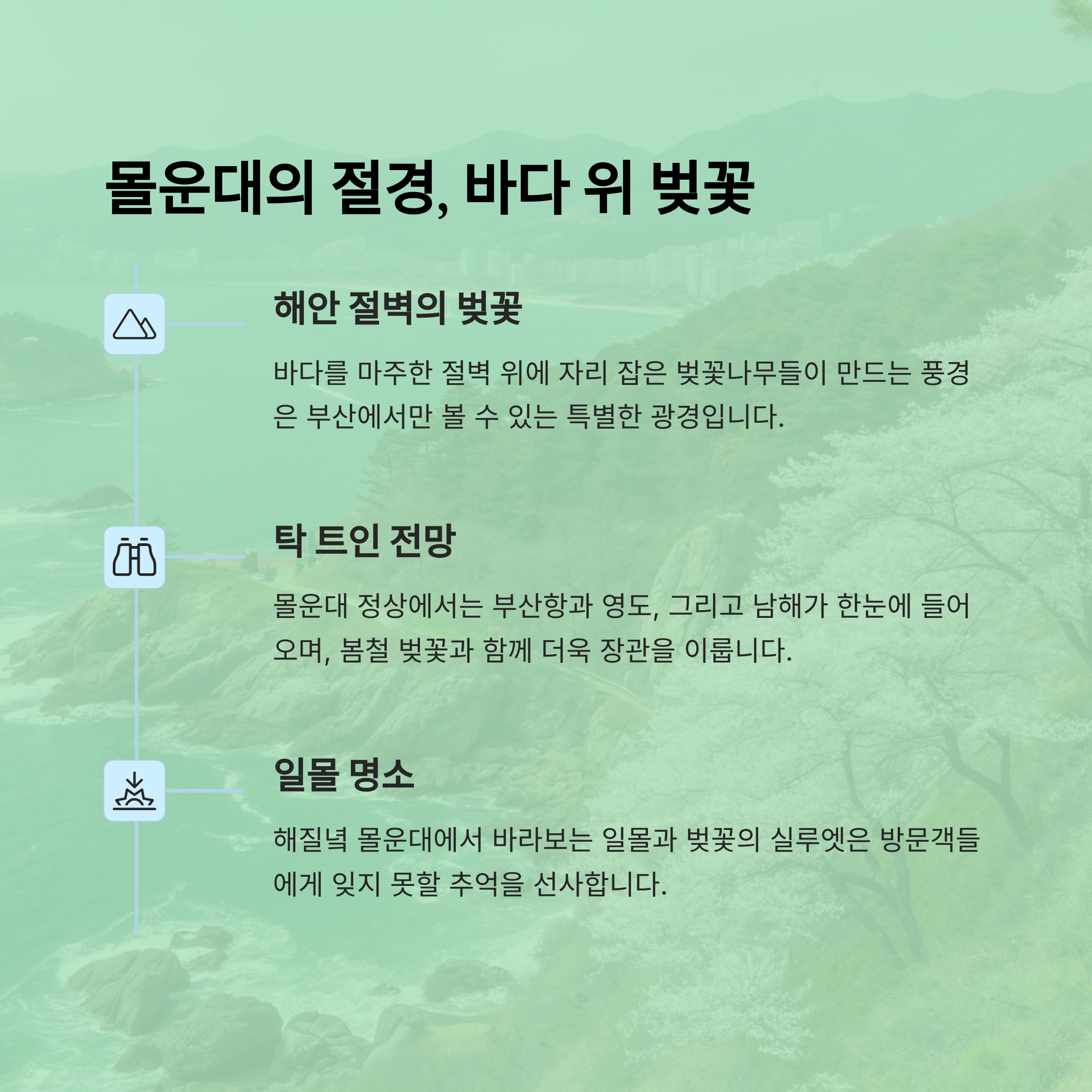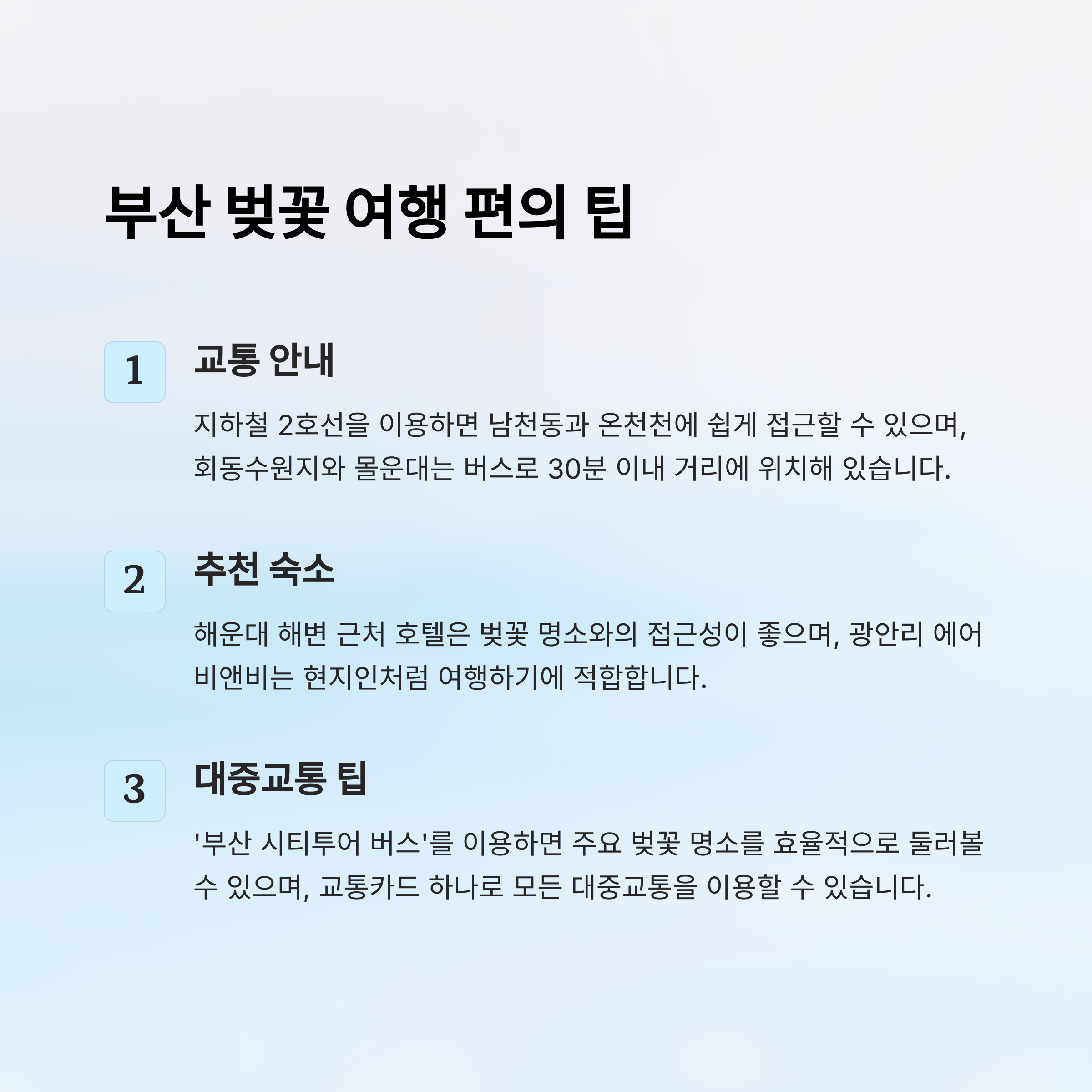 | 남천동 삼익비치, 회동수원지, 몰운대 | 고요한 호수와 자연 벚꽃길의 조화 | 대중교통으로 접근 용이한 명소 다수 |