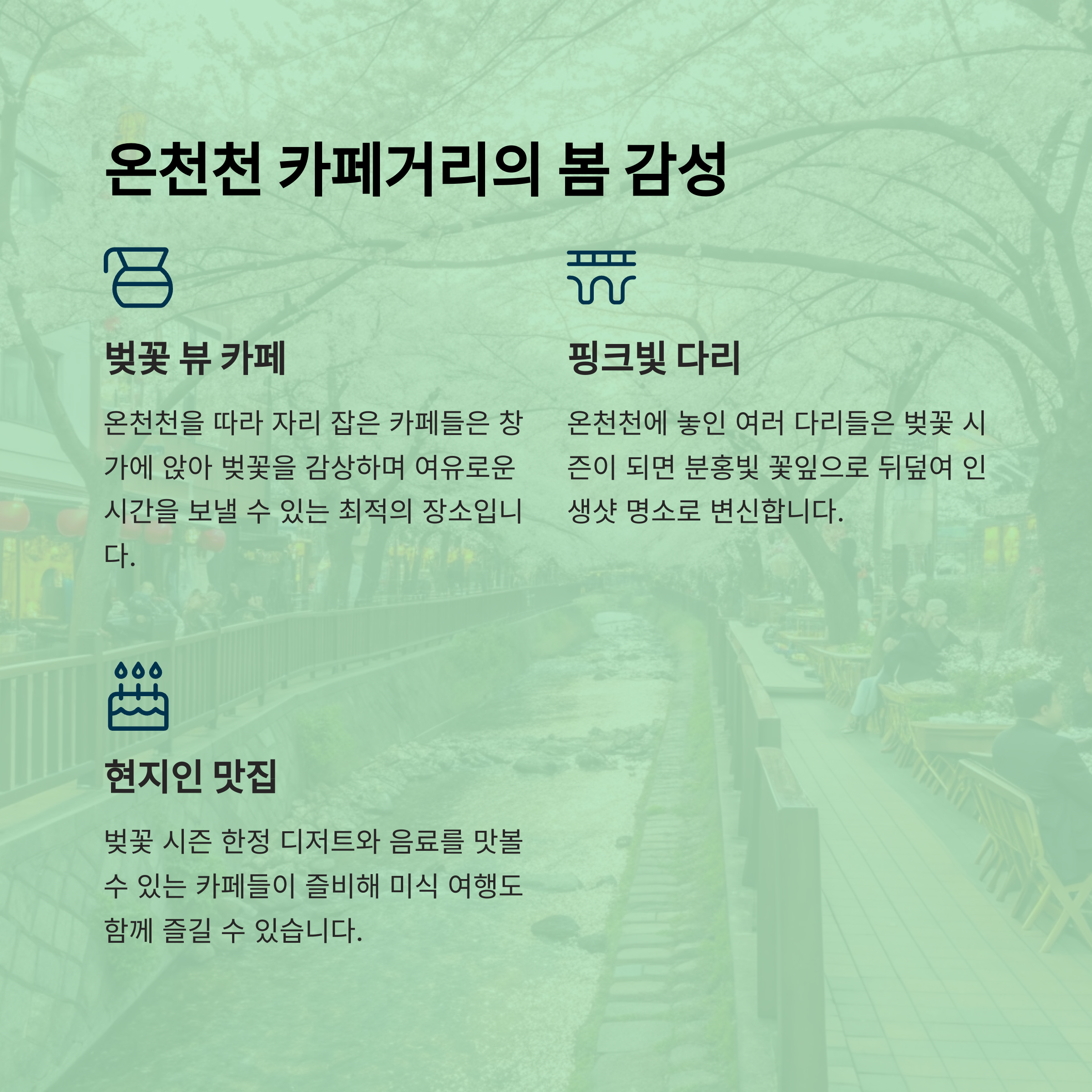 | 관광객보다 현지인 방문 비율 높음 | 감성 카페 거리와 벚꽃길이 어우러짐 | 지하철, 버스 연계성 뛰어남 |