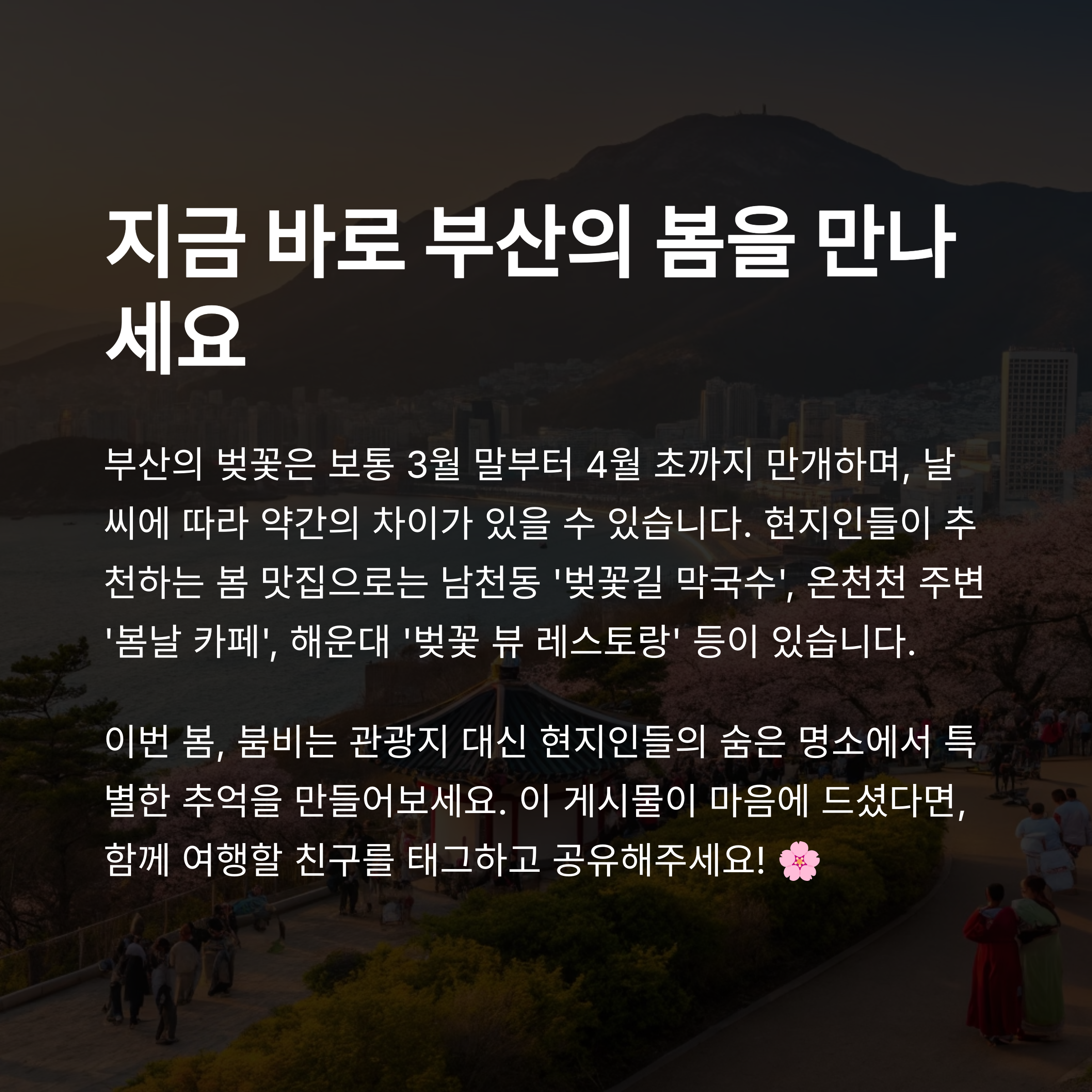부산의 숨은 봄 명소 중 마음에 드는 곳은 어디인가요? 여러분의 추천 장소도 댓글로 함께 공유해주세요. 서로의 여행 이야기를 통해 더 풍성한 봄을 만들어가요.