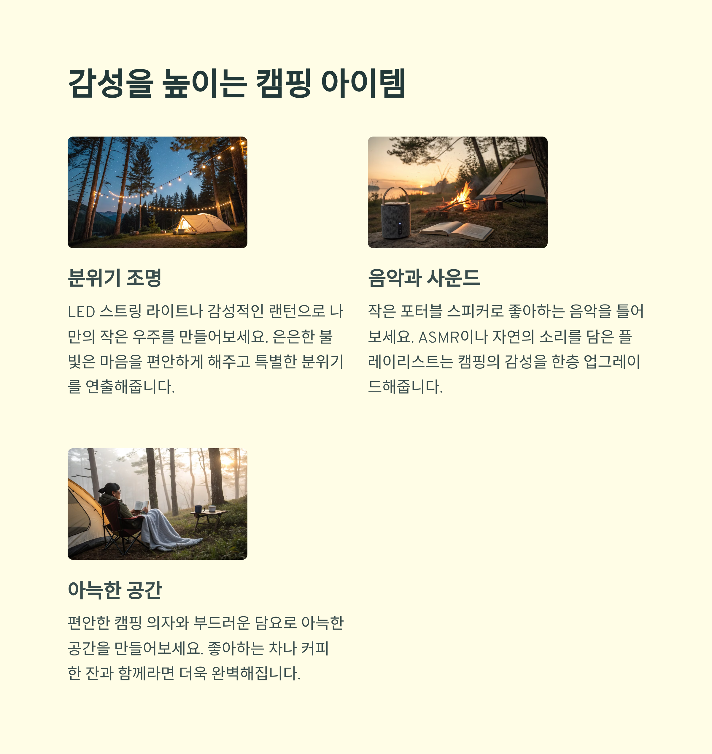 필수 준비물에는 텐트, 침낭, 랜턴, 응급 키트가 포함됩니다. 또한 감성 아이템으로 책, 음악, 저널 등을 챙기면 더욱 풍성한 캠핑이 됩니다.