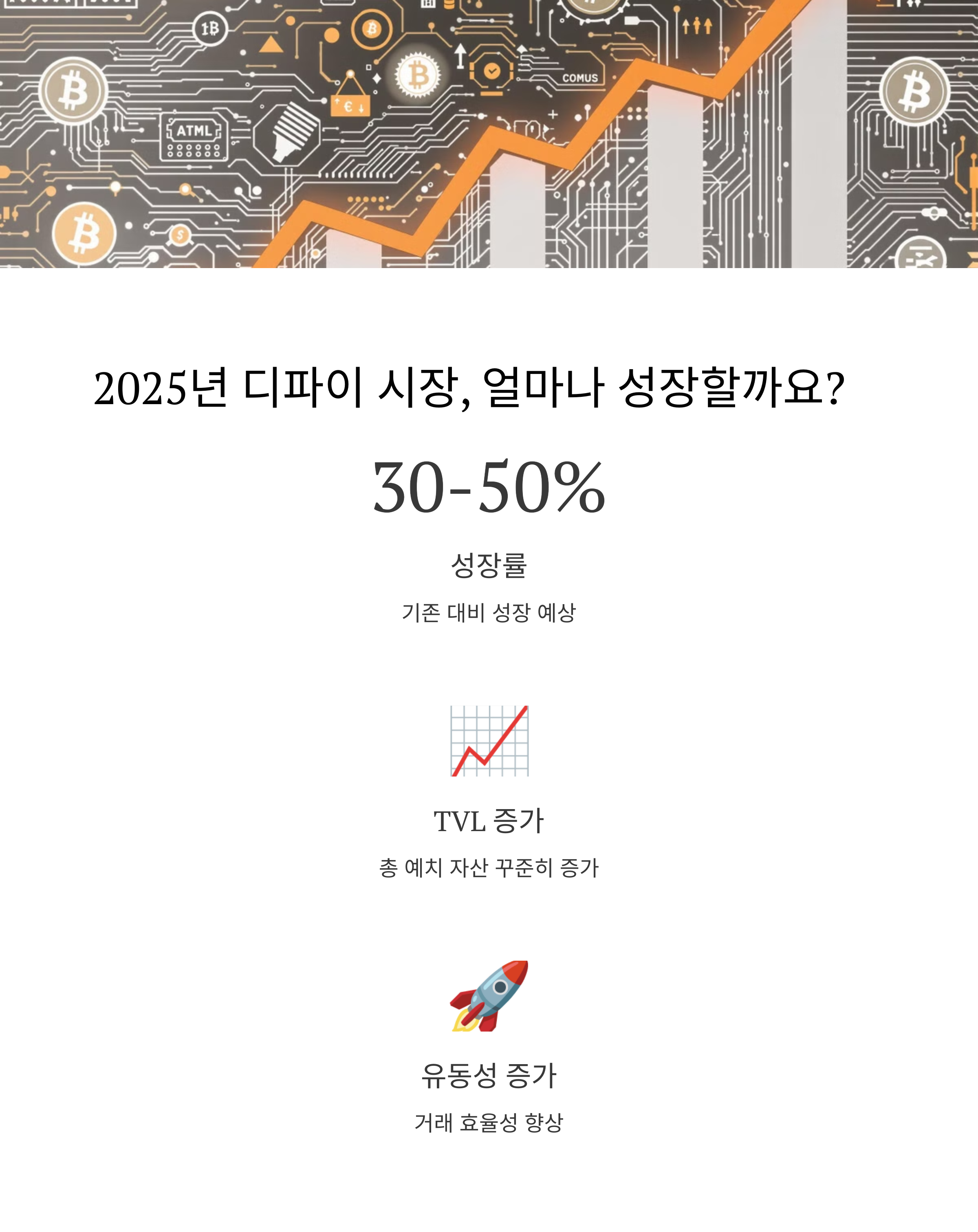 디파이 시장은 2025년까지 기존 대비 30~50% 이상 성장할 것으로 예상됩니다. 주목할 만한 점은 TVL(총 예치 자산)의 꾸준한 증가와 함께 기관 투자자들의 본격적인 진입이 예상된다는 것입니다.