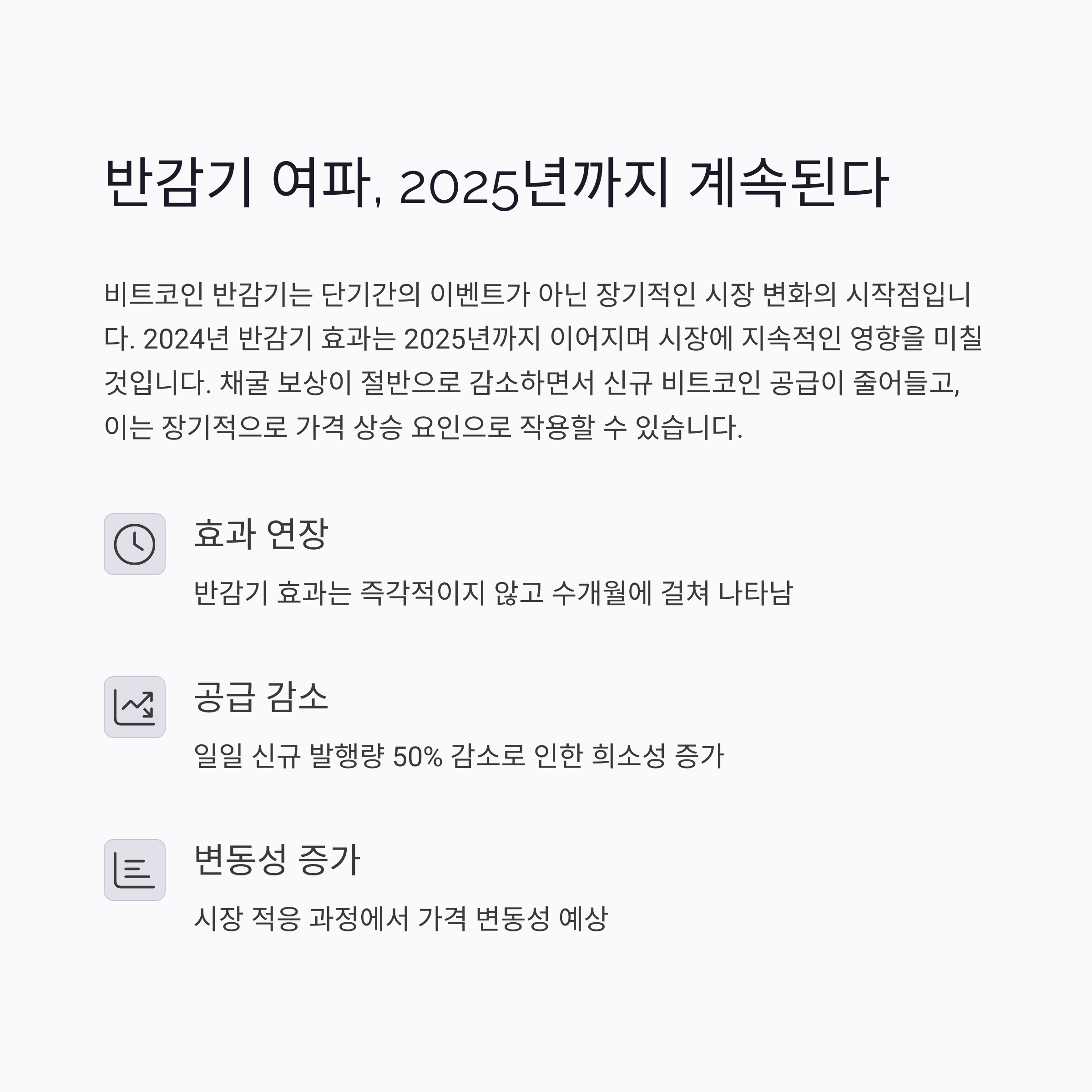 2024년 반감기의 여파가 시장에 반영되는 시기이며, 가격 변동성이 극대화될 수 있어 투자 전략 점검이 중요합니다.
