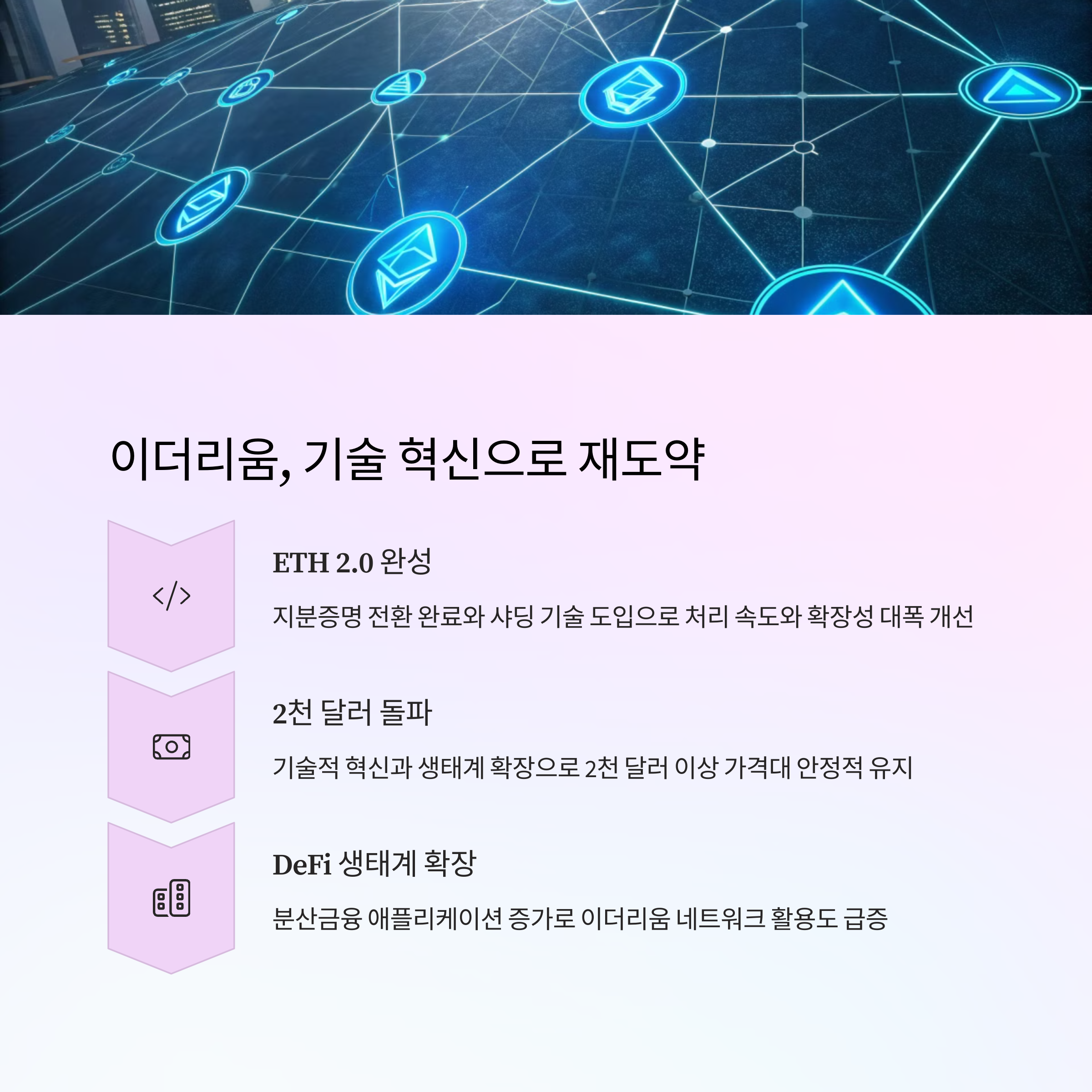 | 기관투자자의 관심으로 인한 강한 상승 압력 | 이더리움 2.0, Layer-2 확장 기술 도입 | 빠른 처리속도와 저렴한 수수료로 생태계 확장 |
