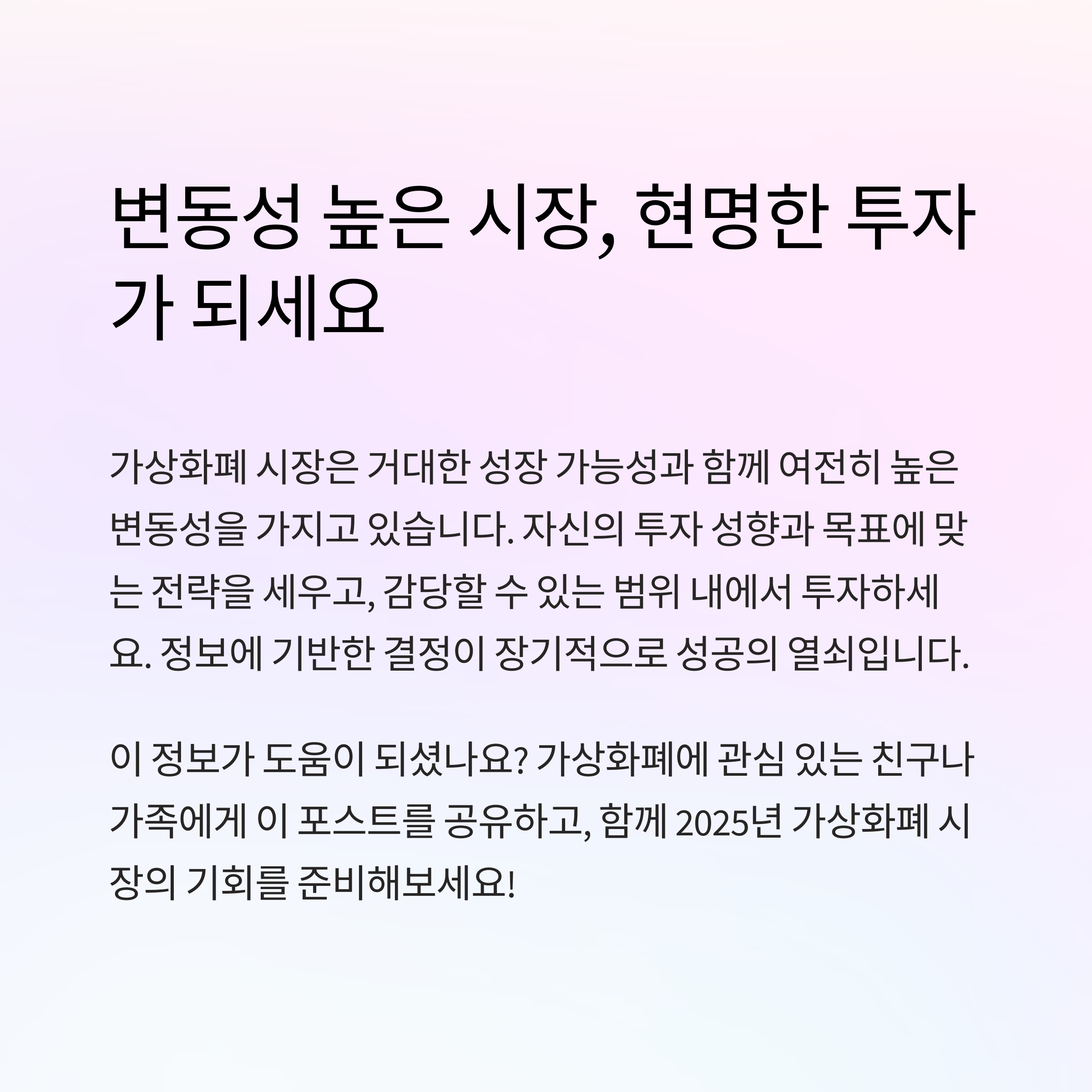2025년 4월은 가상화폐 시장에 있어 회복의 신호탄이 될 수 있습니다. 비트코인의 회복세, 이더리움의 기술 혁신, 그리고 솔라나의 생태계 확장 모두가 시장의 긍정적인 흐름을 이끄는 핵심 요소로 자리하고 있습니다. 투자자들은 시장의 기술적 지표와 글로벌 흐름을 균형 있게 고려하여 전략을 수립해야 하며, 특히 장기적인 비전 속에서 코인별 역할을 명확히 이해하는 것이 중요합니다. 감정에 흔들리지 않고, 데이터와 분석을 기반으로 한 투자 습관이 성공적인 수익 실현의 기반이 됩니다. 오늘의 정보를 바탕으로 보다 지혜롭고 현명한 투자를 이어가시길 바랍니다.
