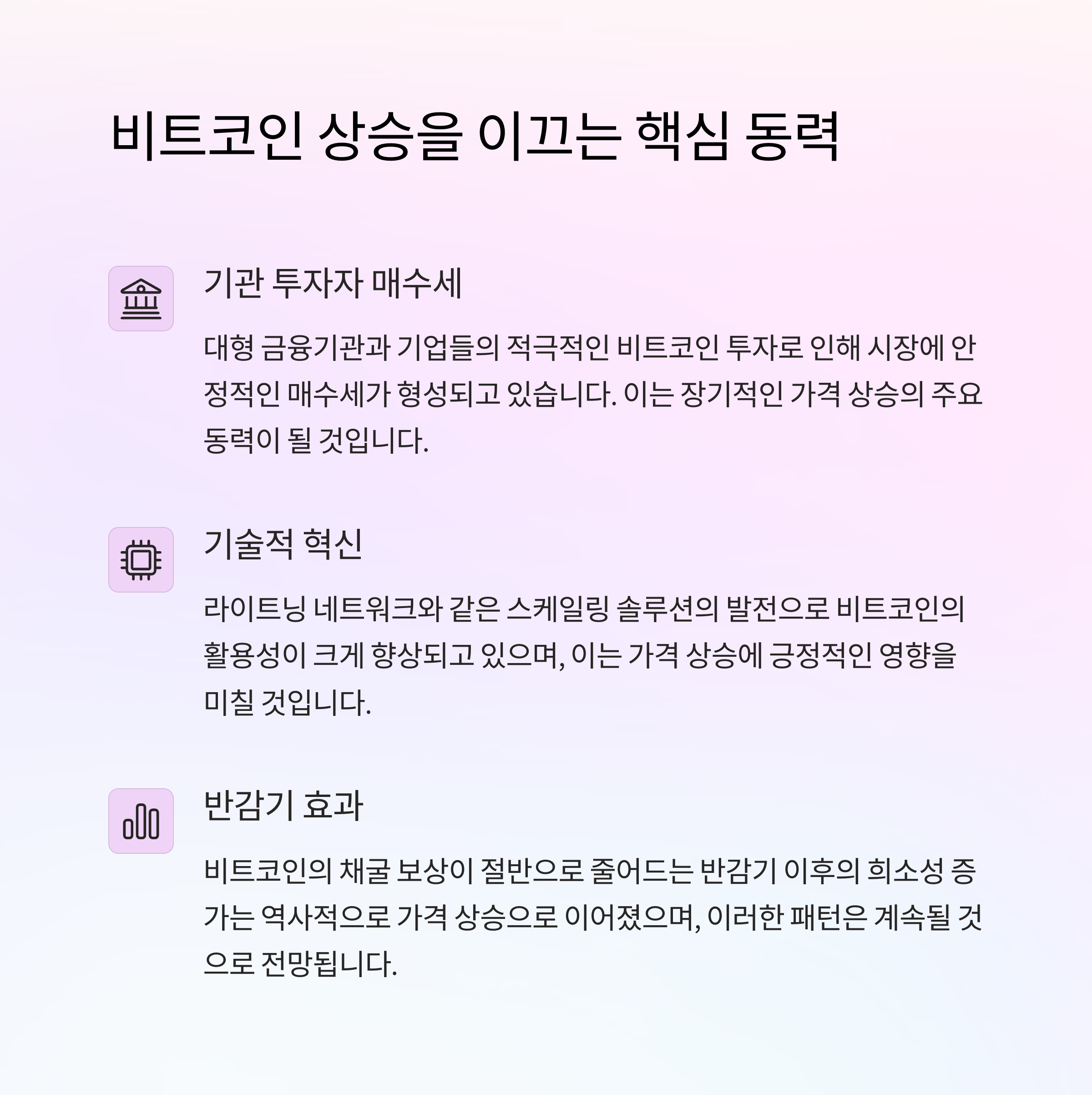 2025년 비트코인은 시장의 중심 자산으로 남을 가능성이 높습니다. 기관 투자와 같은 외부 요소가 긍정적으로 작용해 안정성을 유지할 전망입니다. 최대 $131,743.91까지 상승 잠재력이 있다는 예상은 비트코인의 경쟁력을 보여줍니다. 반면, 가격 변동성이 여전히 높은 상황으로, 투자자들의 신중한 접근이 필요합니다. 규제 환경의 변화는 비트코인의 안정성과 성장성에 중요한 변수로 작용할 것입니다. |