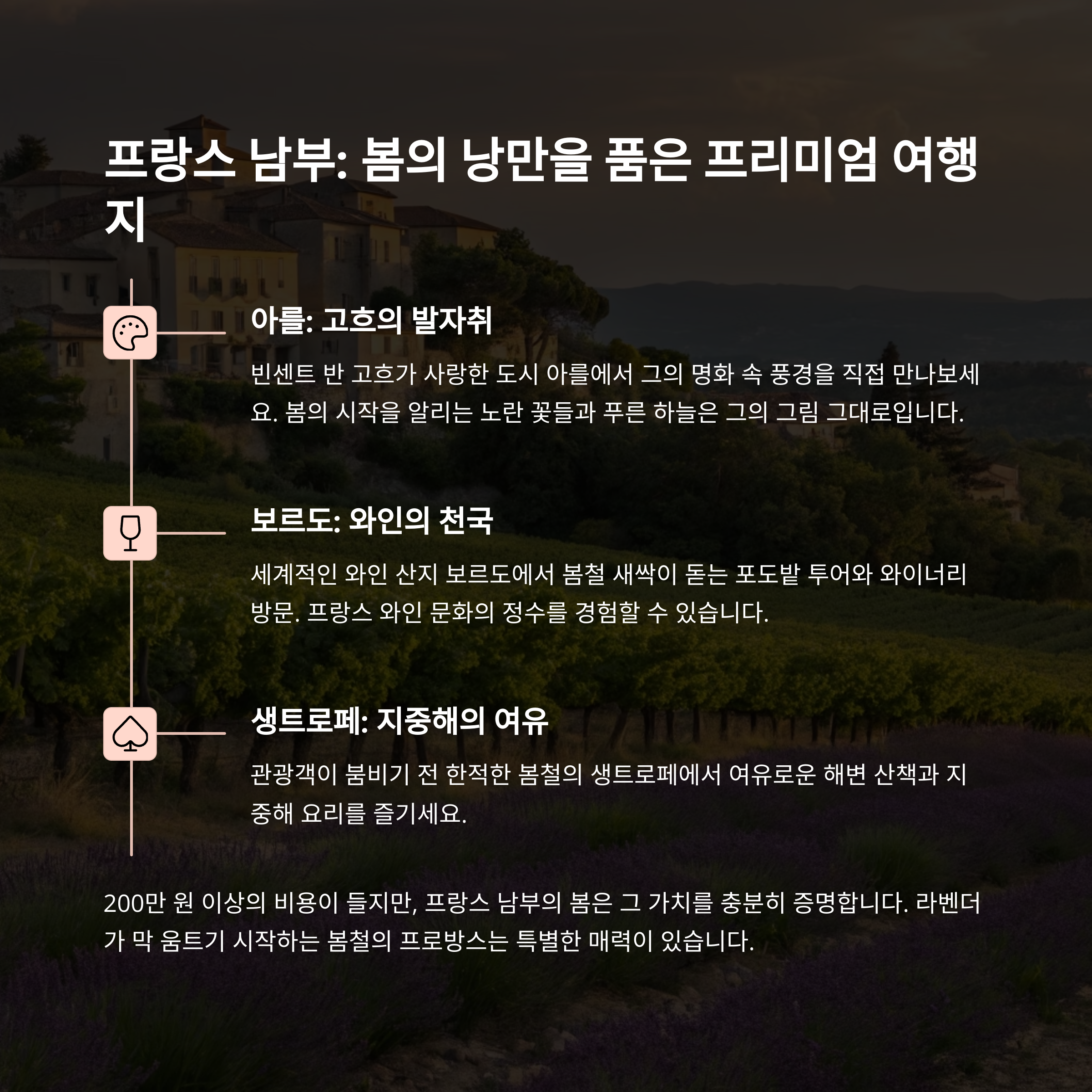 특히 보르도 와인 농장이나 프로방스 지역에서의 여행은 봄의 따뜻함과 풍요를 느낄 수 있게 합니다.