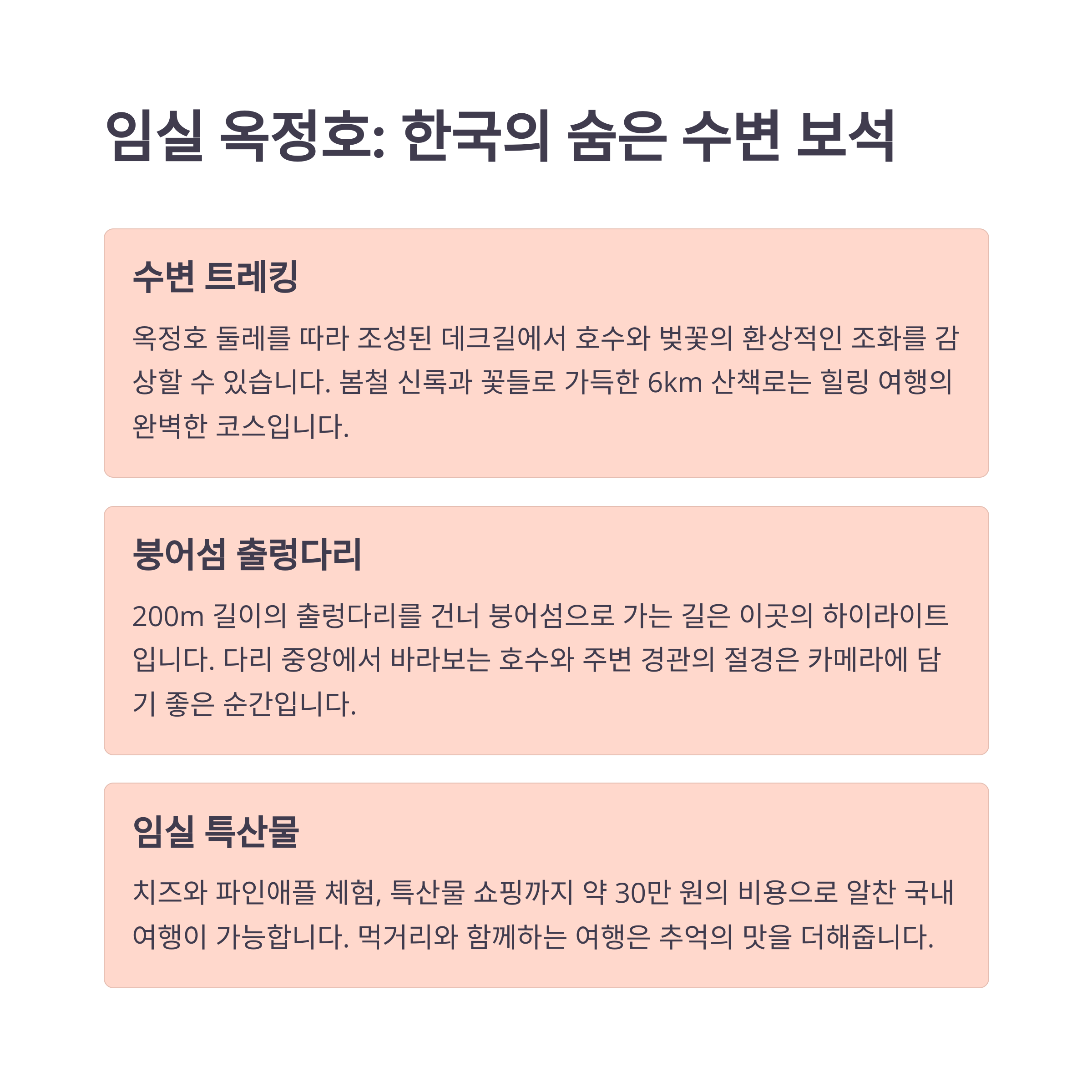 반면, 임실 옥정호처럼 국내 여행지는 경제적이고 간편한 여행 옵션입니다.
