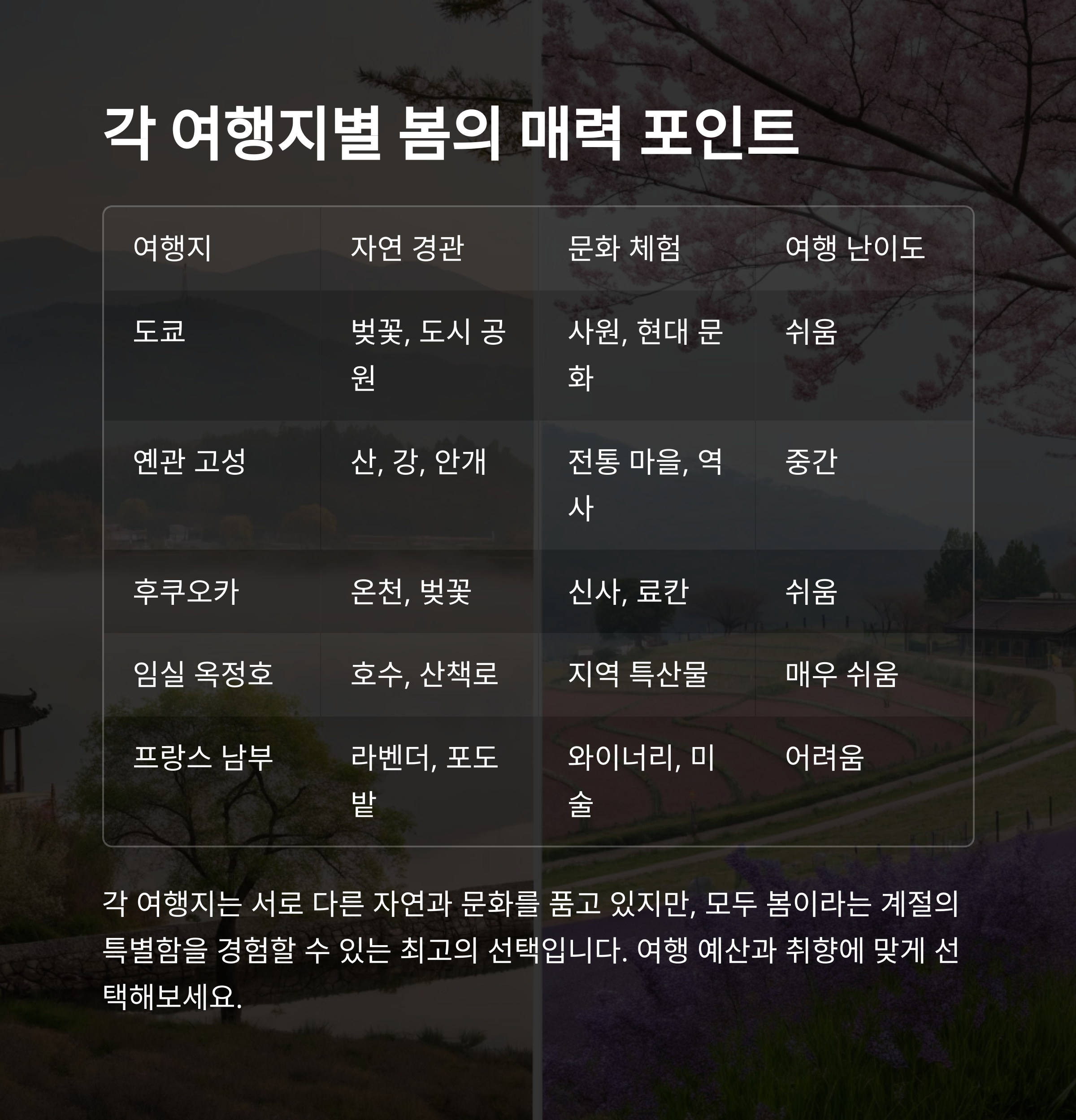 봄 여행은 자연의 아름다움과 독특한 문화를 동시에 경험할 수 있는 최고의 계절입니다.