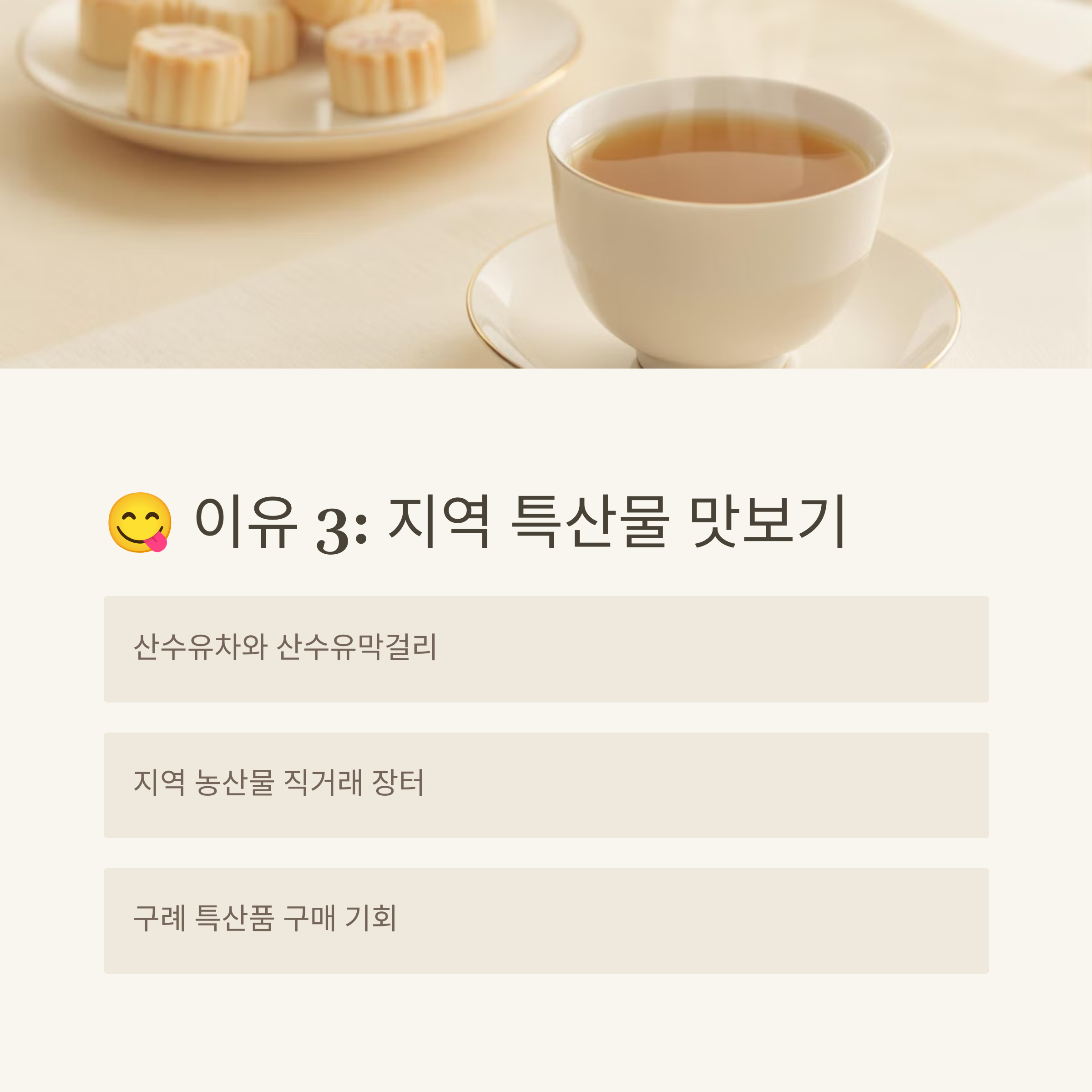 - 전통음식 체험: 구례 지역의 특색 있는 음식을 맛보고 만들어보는 시간
