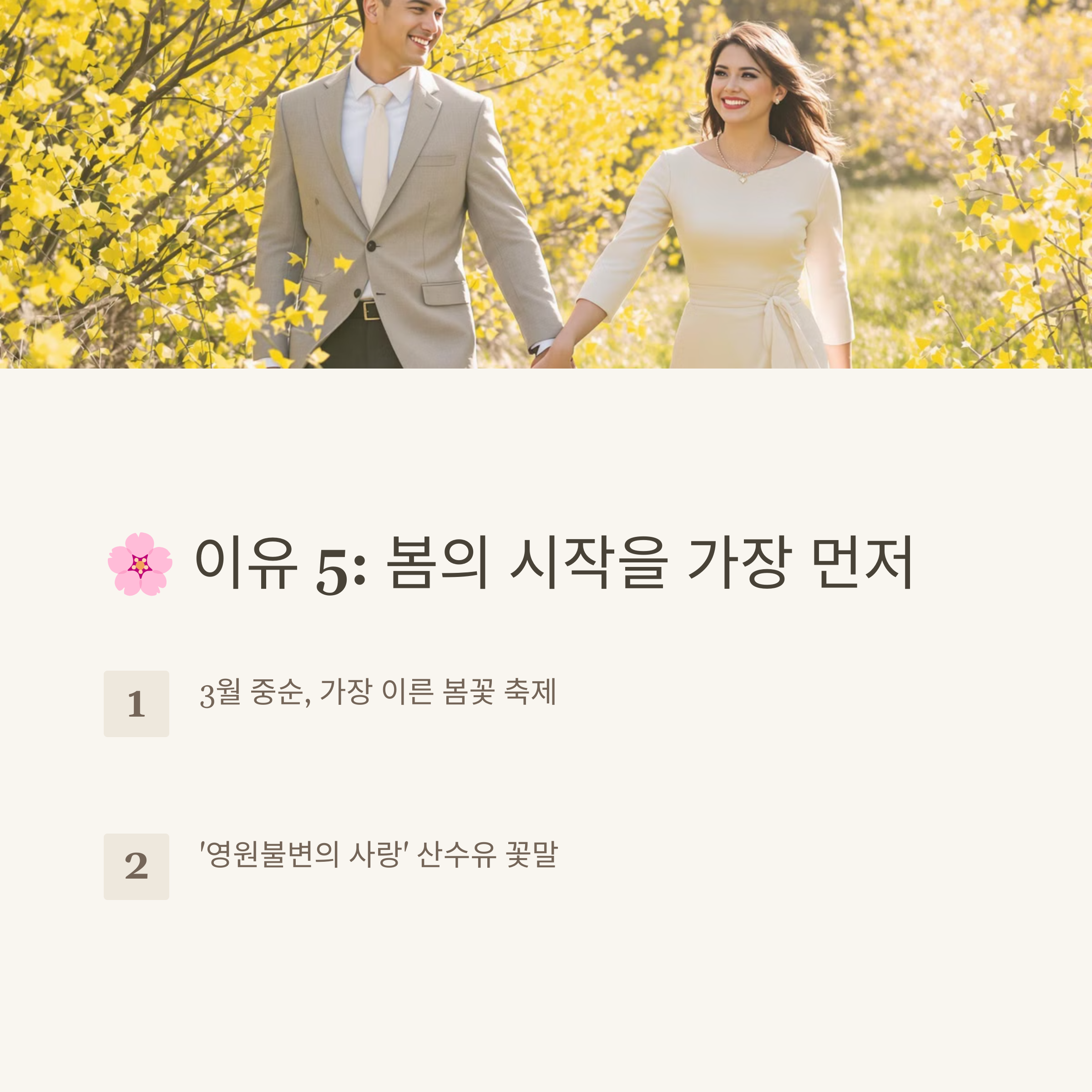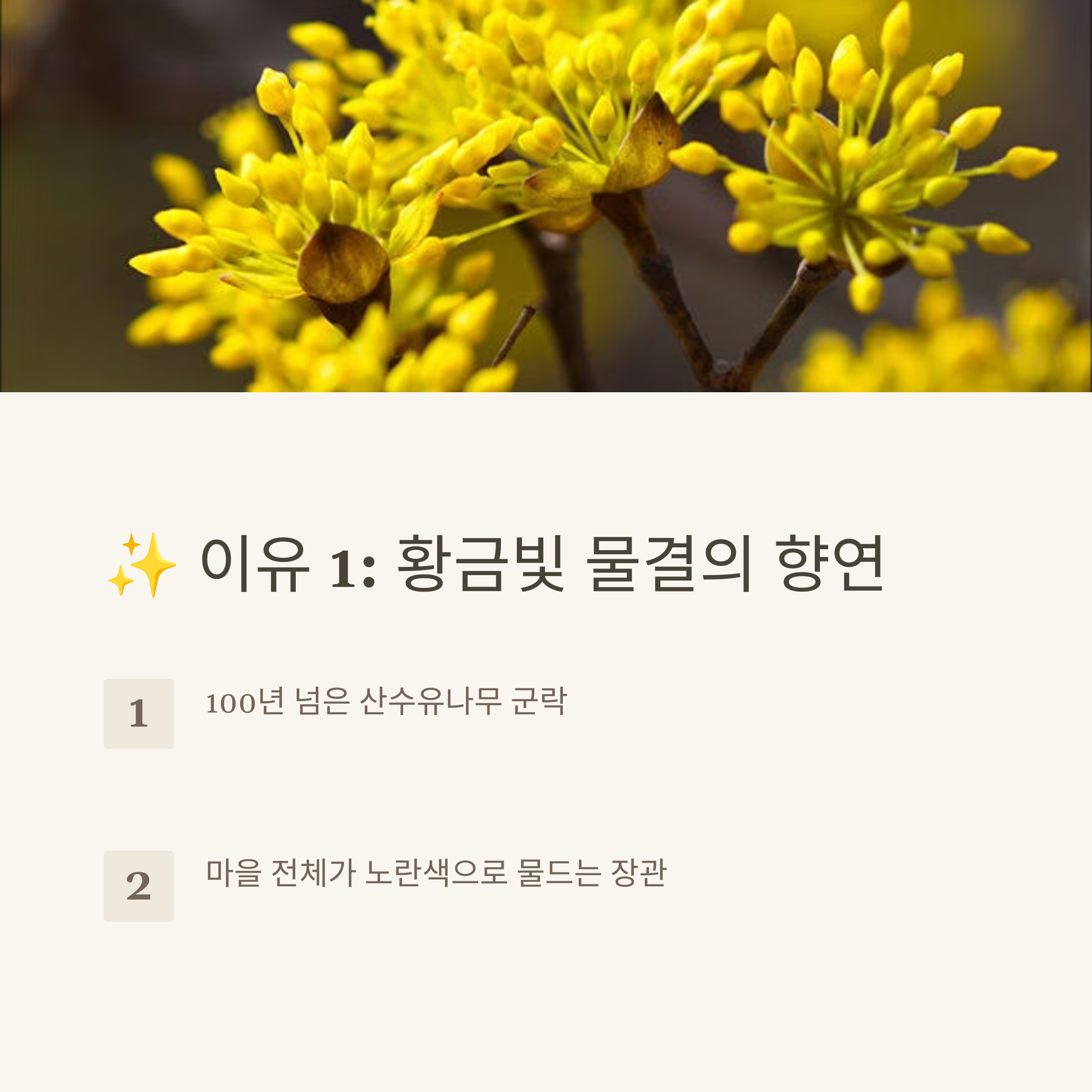 • 산수유꽃 개화시기는 기후에 따라 매년 조금씩 달라질 수 있습니다. 방문 전 공식 홈페이지에서 개화 정보를 꼭 확인하세요.
