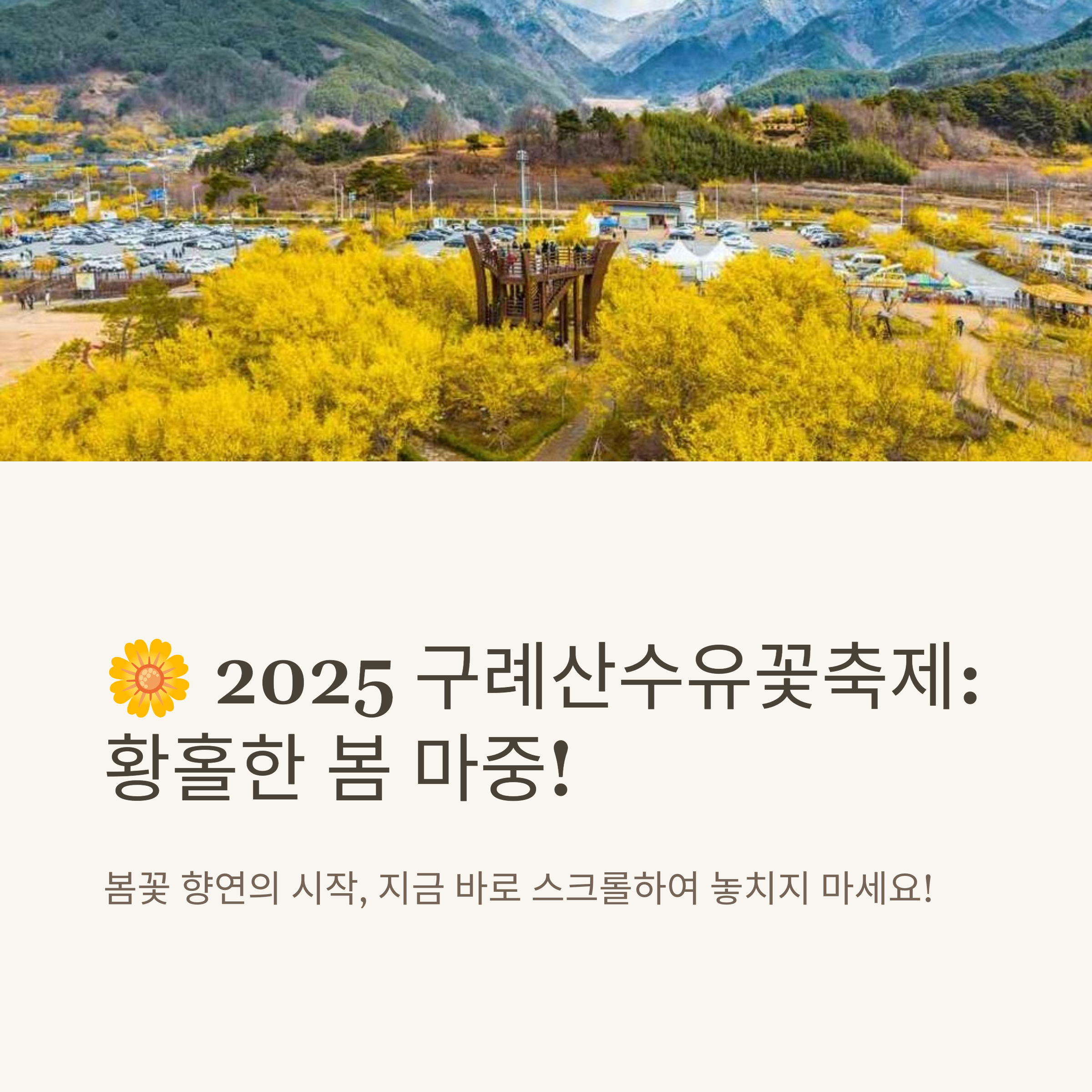 - 산수유꽃 개화시기는 기후에 따라 매년 조금씩 달라질 수 있습니다. 방문 전 공식 홈페이지에서 개화 정보를 꼭 확인하세요.