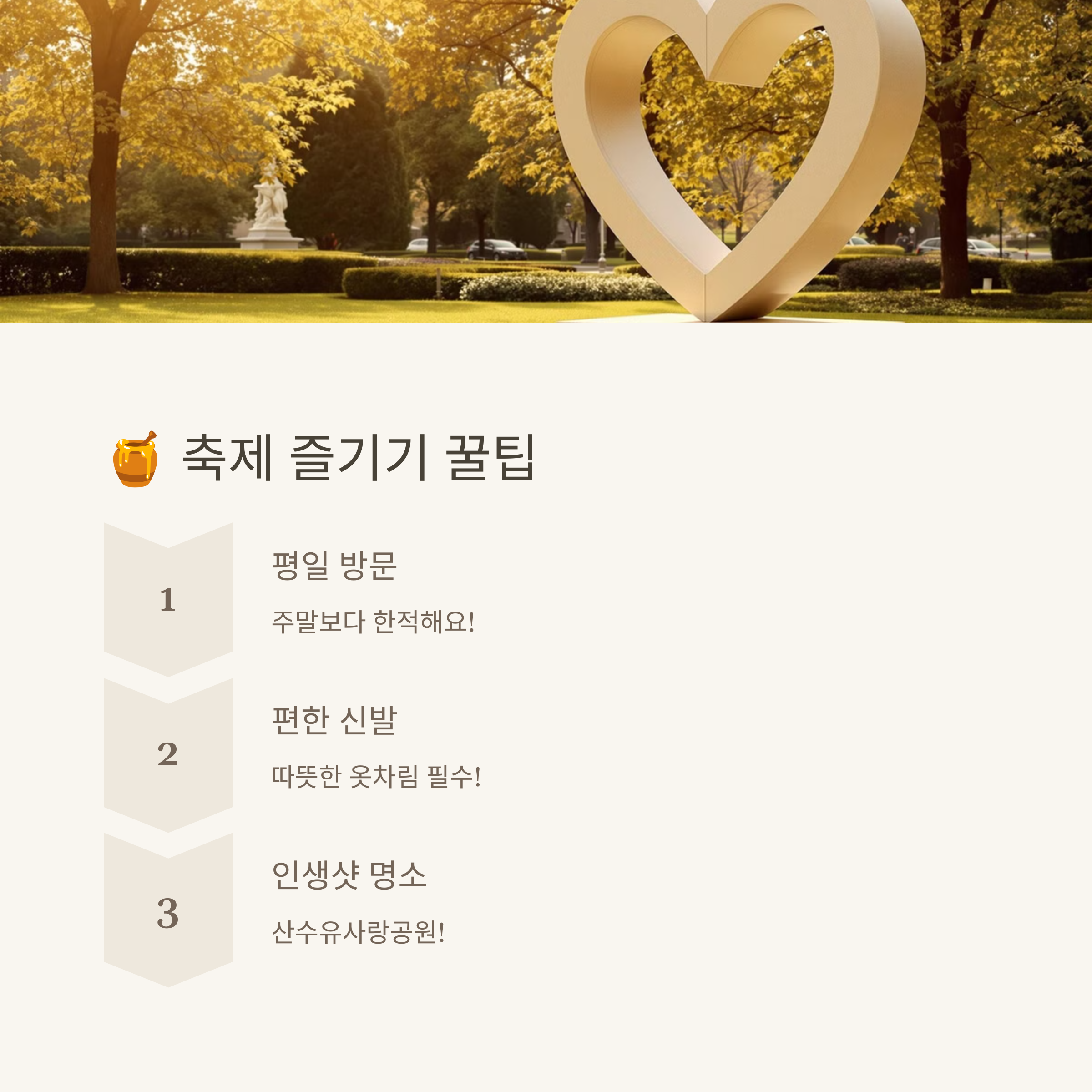 • 평일 방문이 주말보다 훨씬 한적하고 여유롭게 축제를 즐길 수 있습니다.