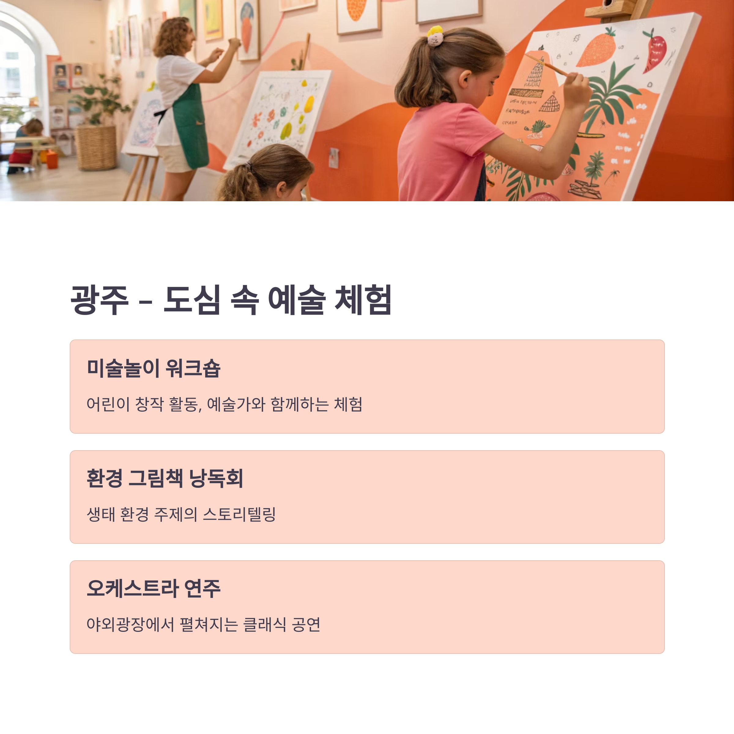미술놀이 워크숍, 환경 그림책 낭독회, 오케스트라 연주 등이