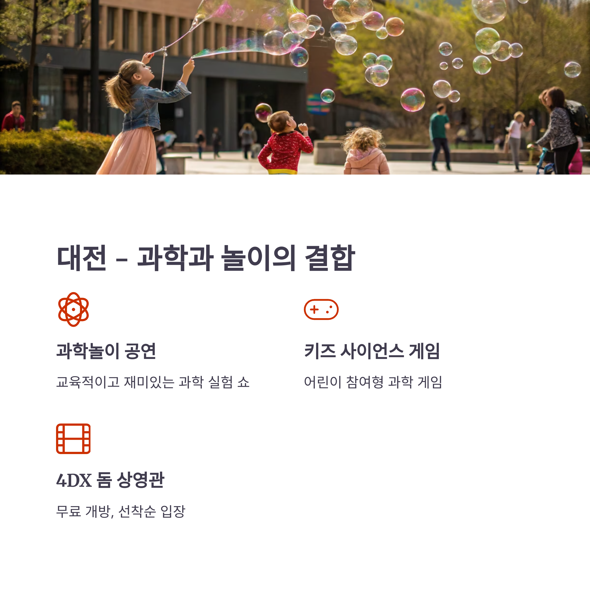 과학놀이 공연, 키즈 사이언스 게임, 대형 비눗방울쇼 등이