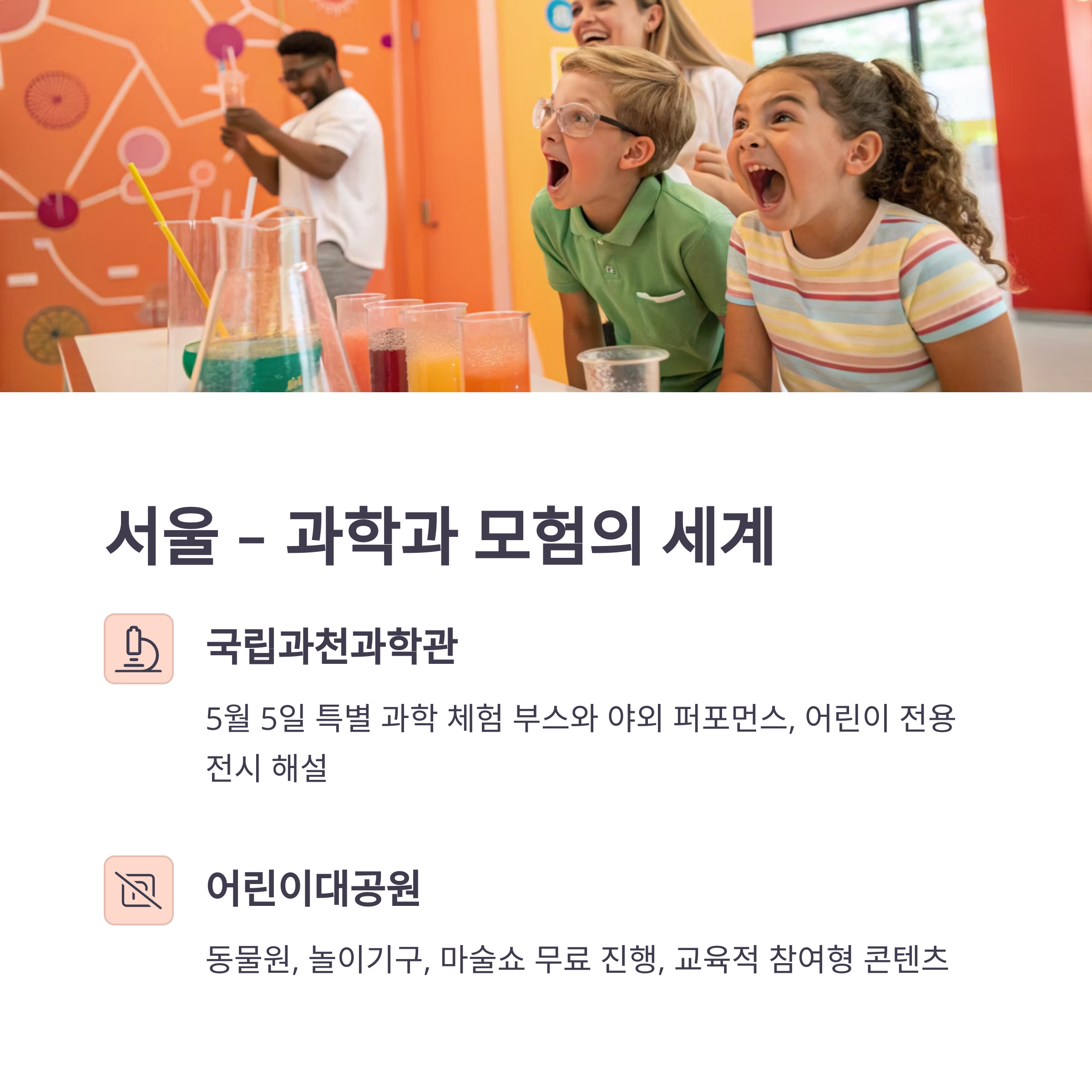서울에서는 국립과천과학관과 어린이대공원이 대표적인 인기 장소입니다.