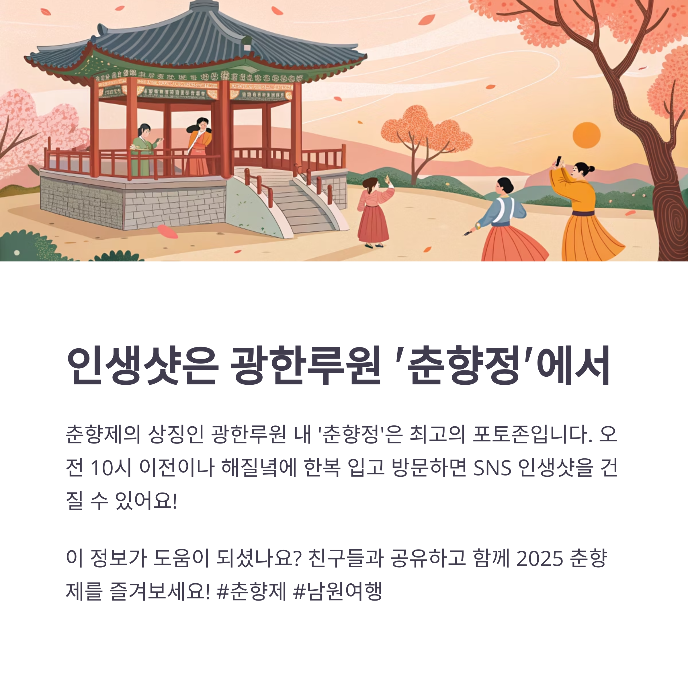 "한복 입고 춘향정에서 찍는 인생샷은 SNS 좋아요 폭발템입니다!"