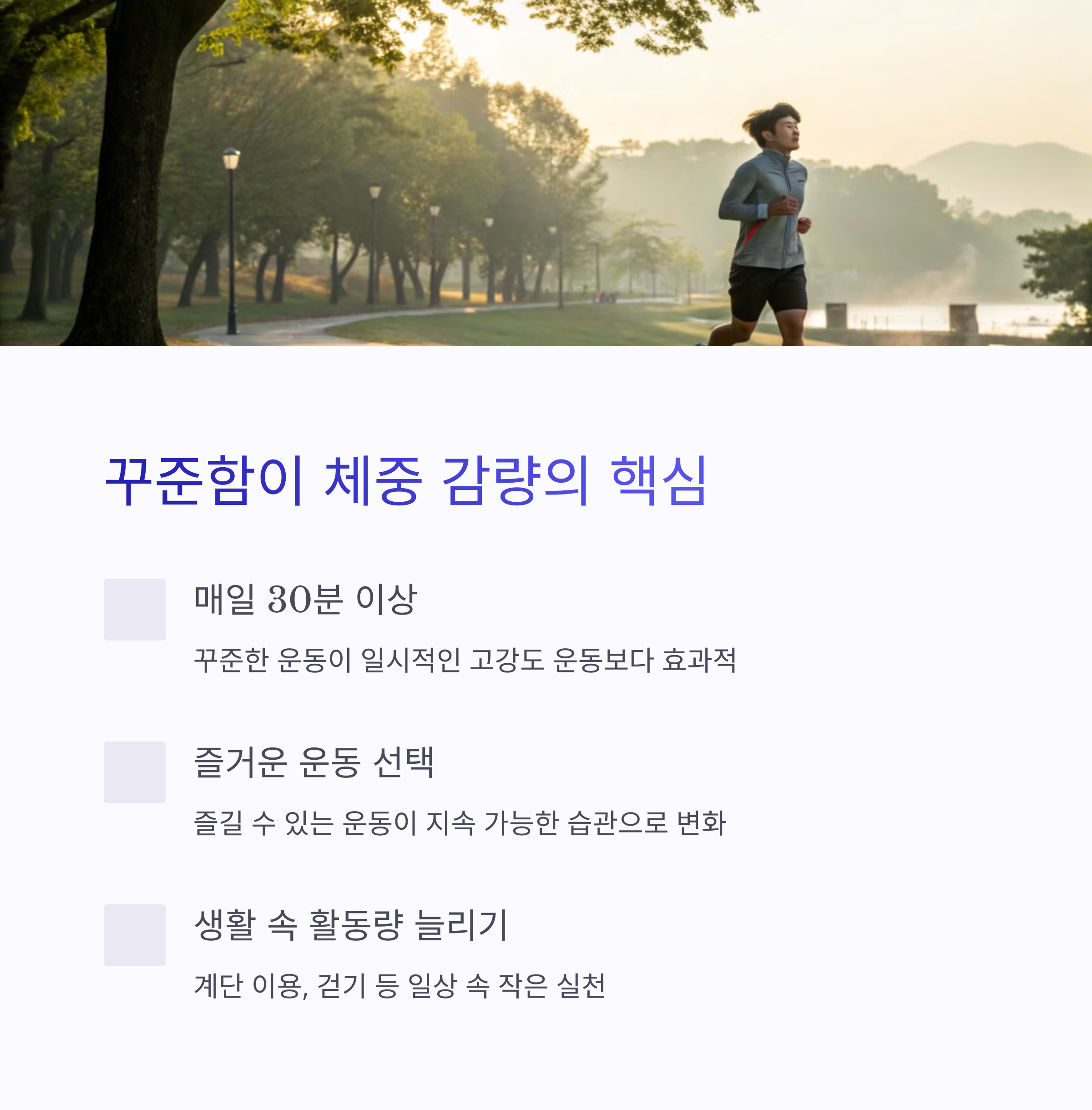 감량 성공자들의 공통점은 꾸준한 운동과 마인드셋 전환입니다. 매일 30분씩 즐길 수 있는 운동을 실천하고, 시간이 지나면서 운동 강도를 점진적으로 높이며 몸에 자극을 주었습니다. 또한 다이어트를 일시적인 프로젝트가 아니라 삶의 일부로 인식하고 지속적으로 관리하는 태도가 중요했습니다. 결국 건강한 습관의 축적이 최고의 결과를 만든다는 것을 실감할 수 있었습니다.