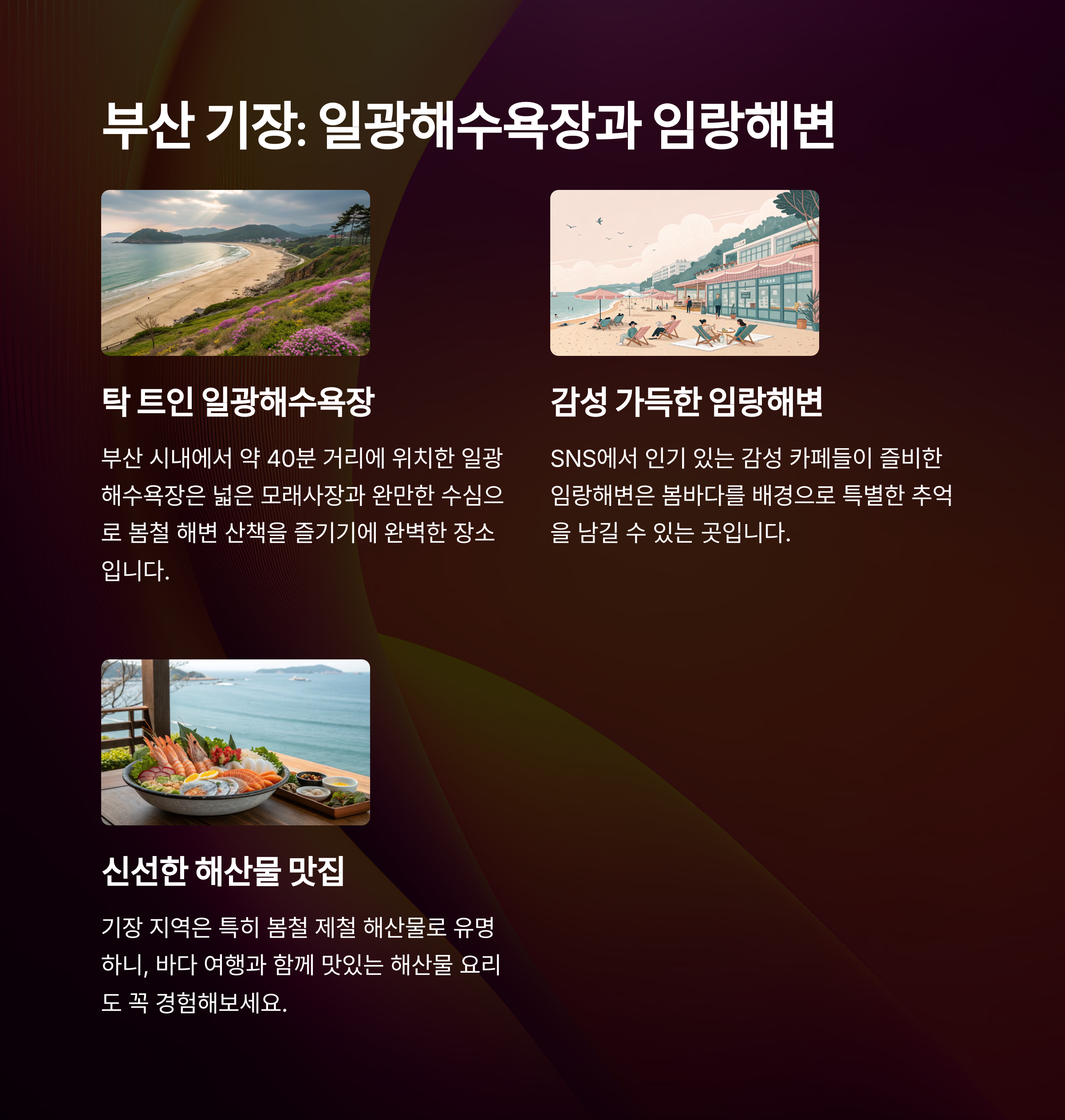 부산 기장은 도심과 가까운 거리임에도 불구하고 조용하고 여유로운 분위기의 봄바다를 즐길 수 있는 특별한 지역입니다. 일광해수욕장과 임랑해변은 벚꽃과 푸른 바다가 어우러진 로맨틱한 풍경을 자랑하며, 인근 카페에서 바다를 바라보며 감성적인 시간을 보낼 수 있습니다. 또한 기장에서는 제철 미역과 다시마 같은 신선한 해산물을 맛보며 현지의 식문화를 체험할 수 있어 봄철 여행지로서의 매력을 한층 더해줍니다. 해안도로를 따라 아침 드라이브를 즐기면, 더 맑고 깨끗한 풍경을 만날 수 있습니다.