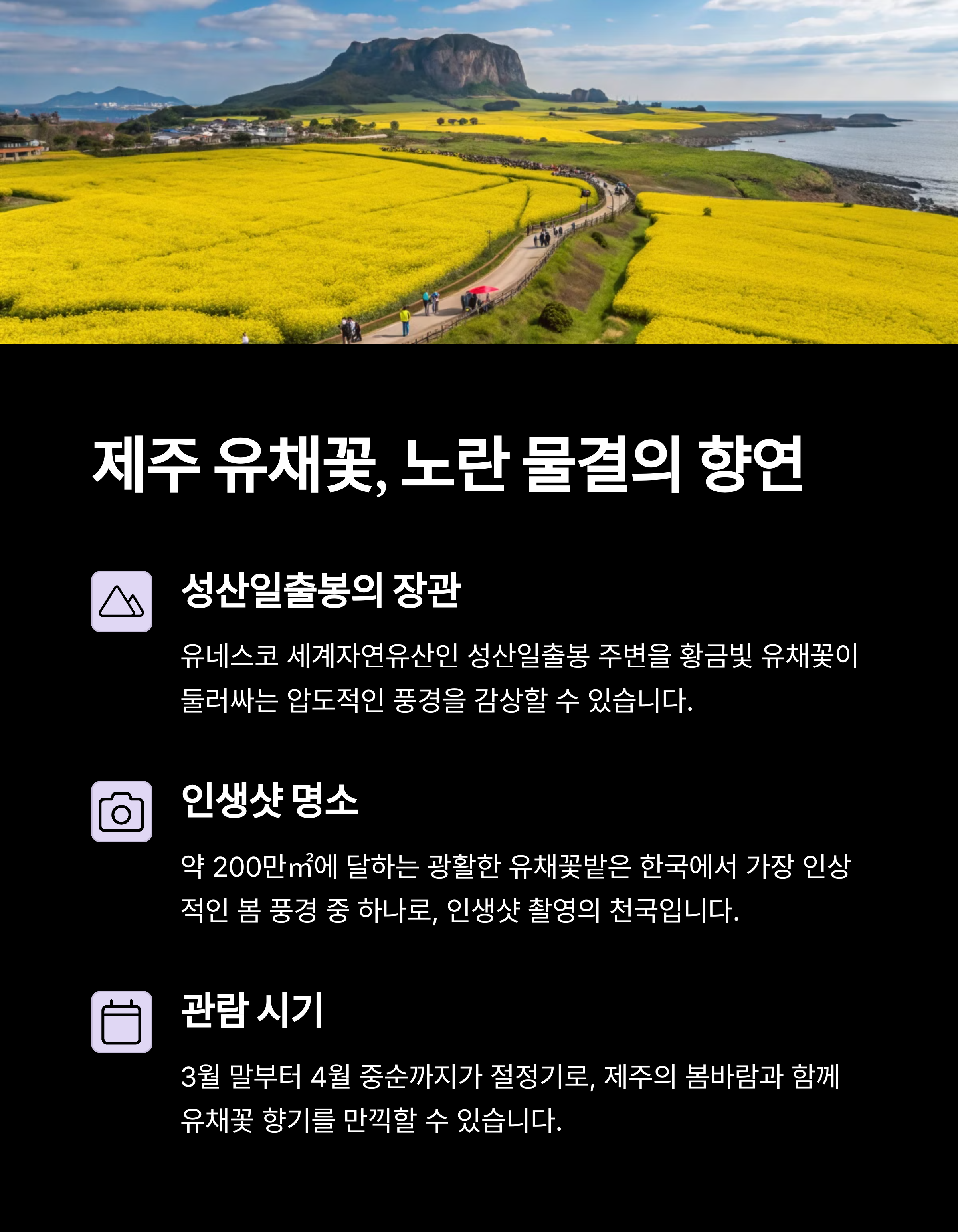 첫 번째 장소는 제주도의 유채꽃밭입니다. 매년 3월 말부터 4월 중순까지 제주 전역에 노란 유채꽃이 물결치며 장관을 이루죠. 특히 성산일출봉 인근은 가장 인기 있는 촬영 명소로 하늘과 바다, 그리고 유채꽃이 어우러진 풍경은 제주만의 독특한 감성을 만들어냅니다. 아침에 방문하면 더욱 선명하고 깨끗한 풍경을 감상할 수 있어 일찍 움직이시는 것을 추천합니다.