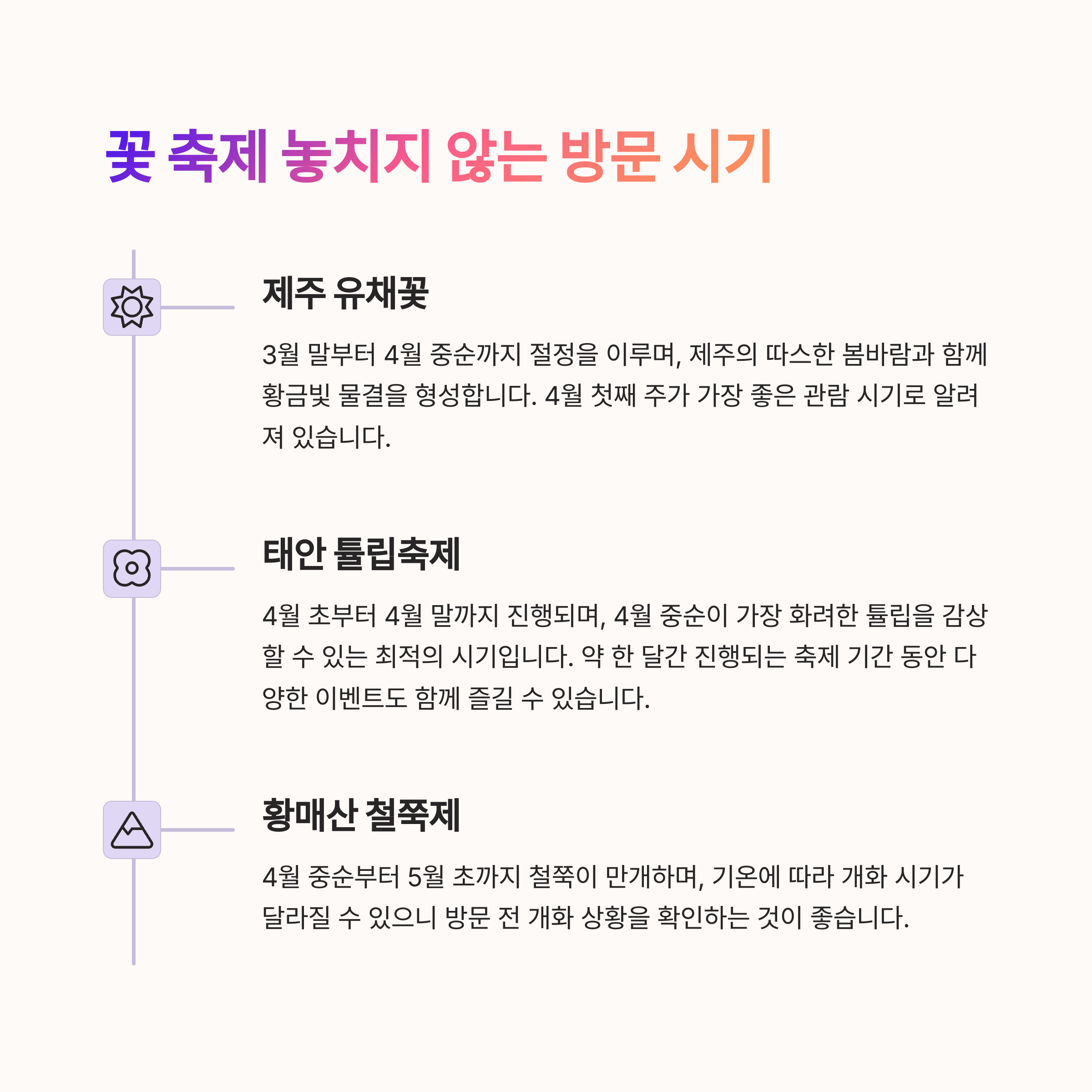 벚꽃 외에도 우리 주변에는 계절의 아름다움을 만끽할 수 있는 수많은 봄꽃 명소들이 존재합니다. 제주도의 유채꽃은 따스한 햇살과 노란 물결로, 태안의 튤립은 화려한 색감으로, 황매산 철쭉은 자연의 위엄과 감동으로 우리를 사로잡습니다. 매년 반복되는 계절일지라도, 그 안에서 우리는 새로움을 찾고 또 다른 감동을 느낄 수 있습니다. 이번 봄, 소중한 사람들과 함께 꽃이 피는 여행지로 짧지만 깊은 추억을 만들어보는 건 어떨까요? 여러분의 봄이 향기롭고 따뜻하게 채워지길 바랍니다.