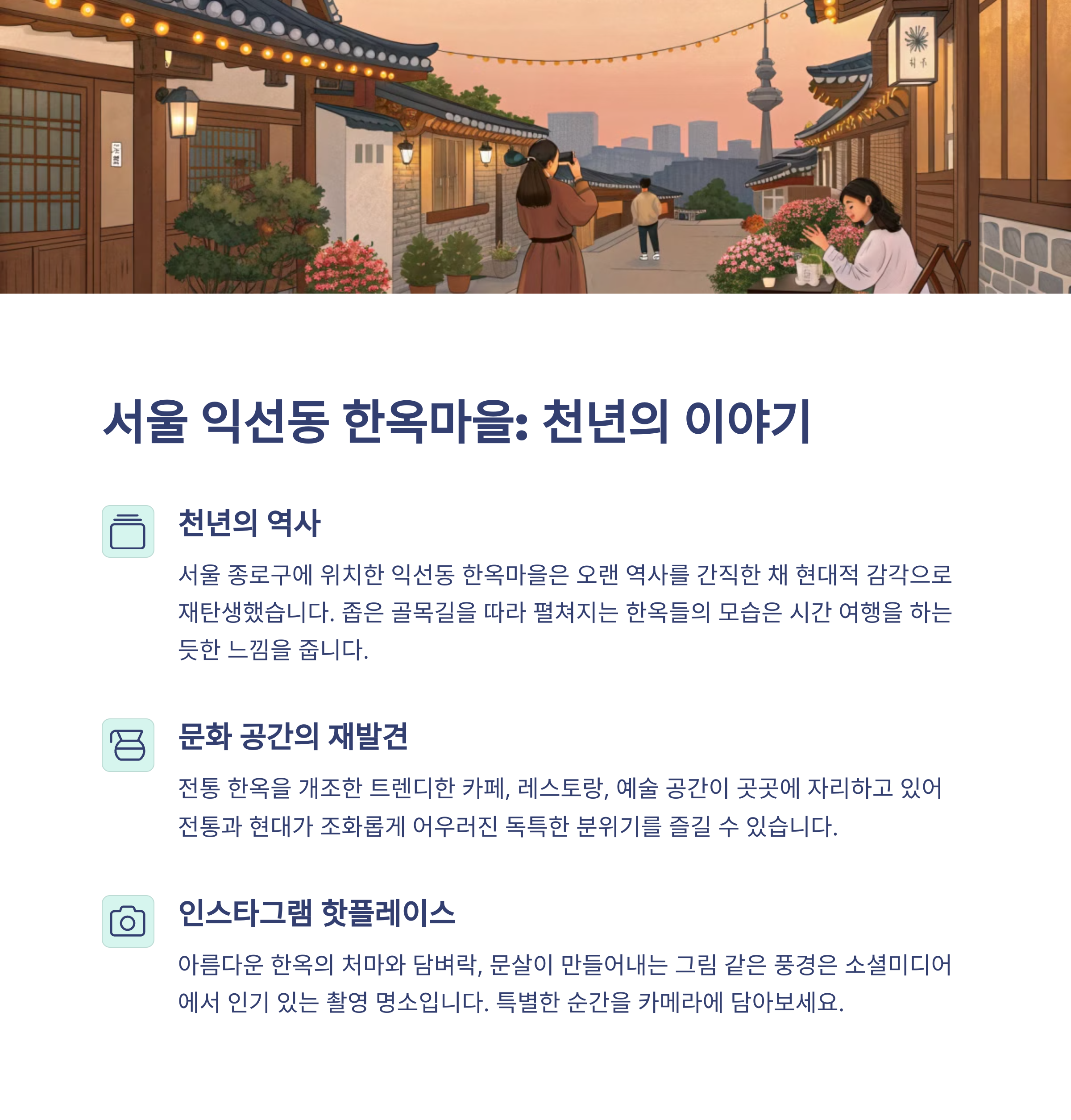 북촌, 익선동, 전주 한옥마을 모두 한국문화의 깊이를 느낄 수 있는 최적의 여행지입니다.
