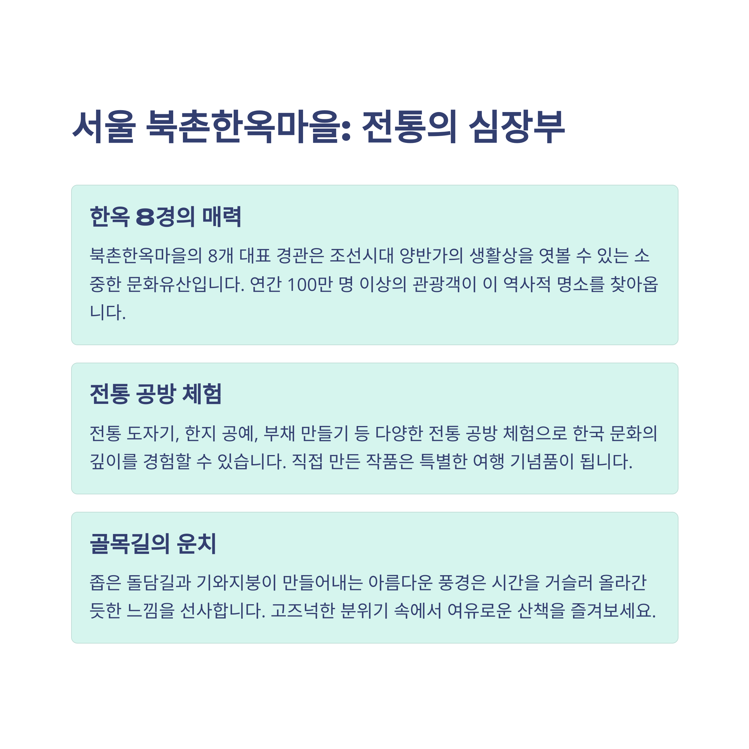 북촌 한옥마을은 서울 중심부에 위치하여 접근성이 뛰어나고, 도심과 전통이 어우러진 경험을 제공합니다.