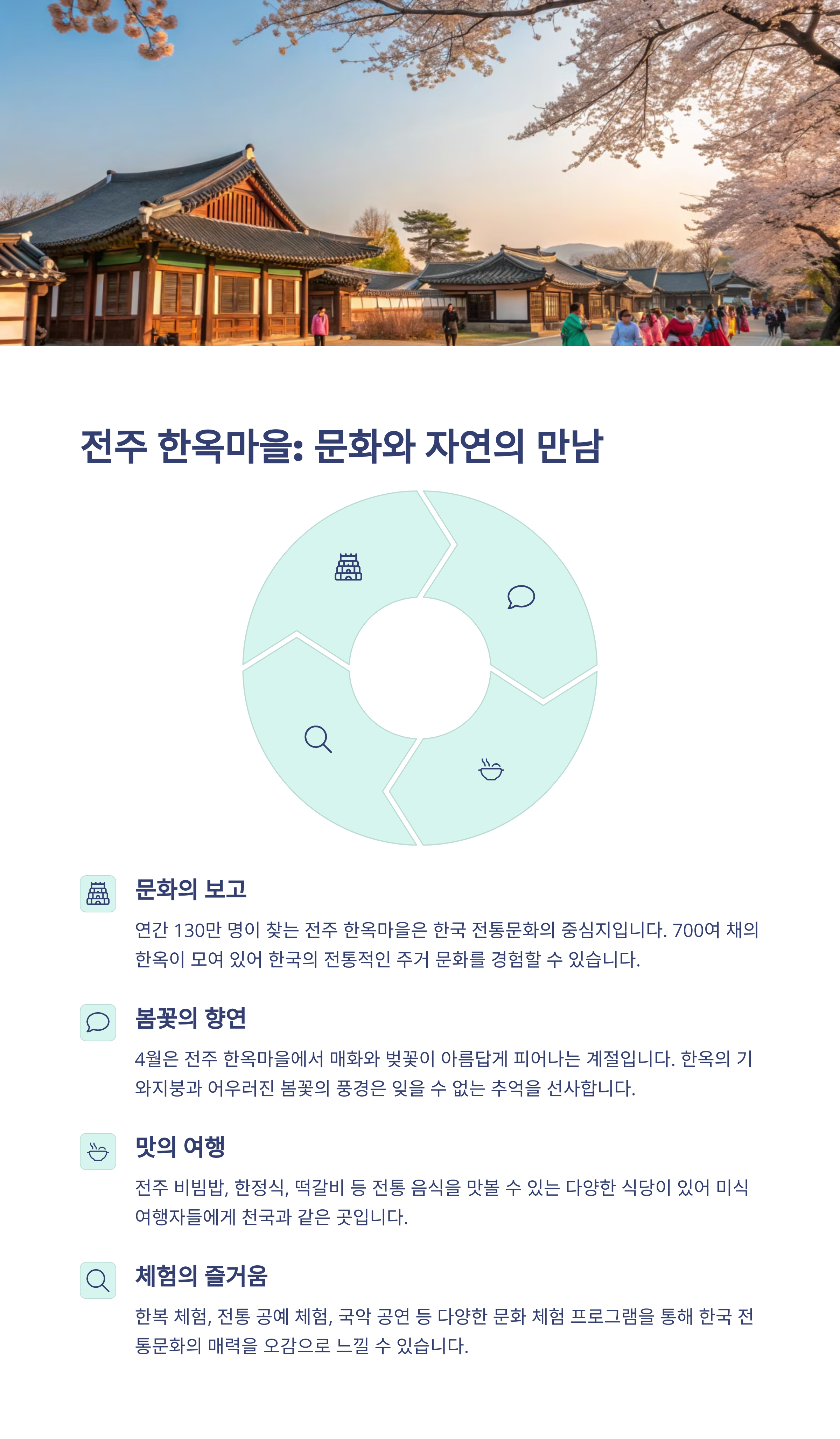 전주 한옥마을은 따로 찾아갈 가치가 있습니다. 특히 벚꽃으로 덮인 봄 장면도 소중하며, 오목대 및 전동성당도 근처 코스로 최고입니다.
