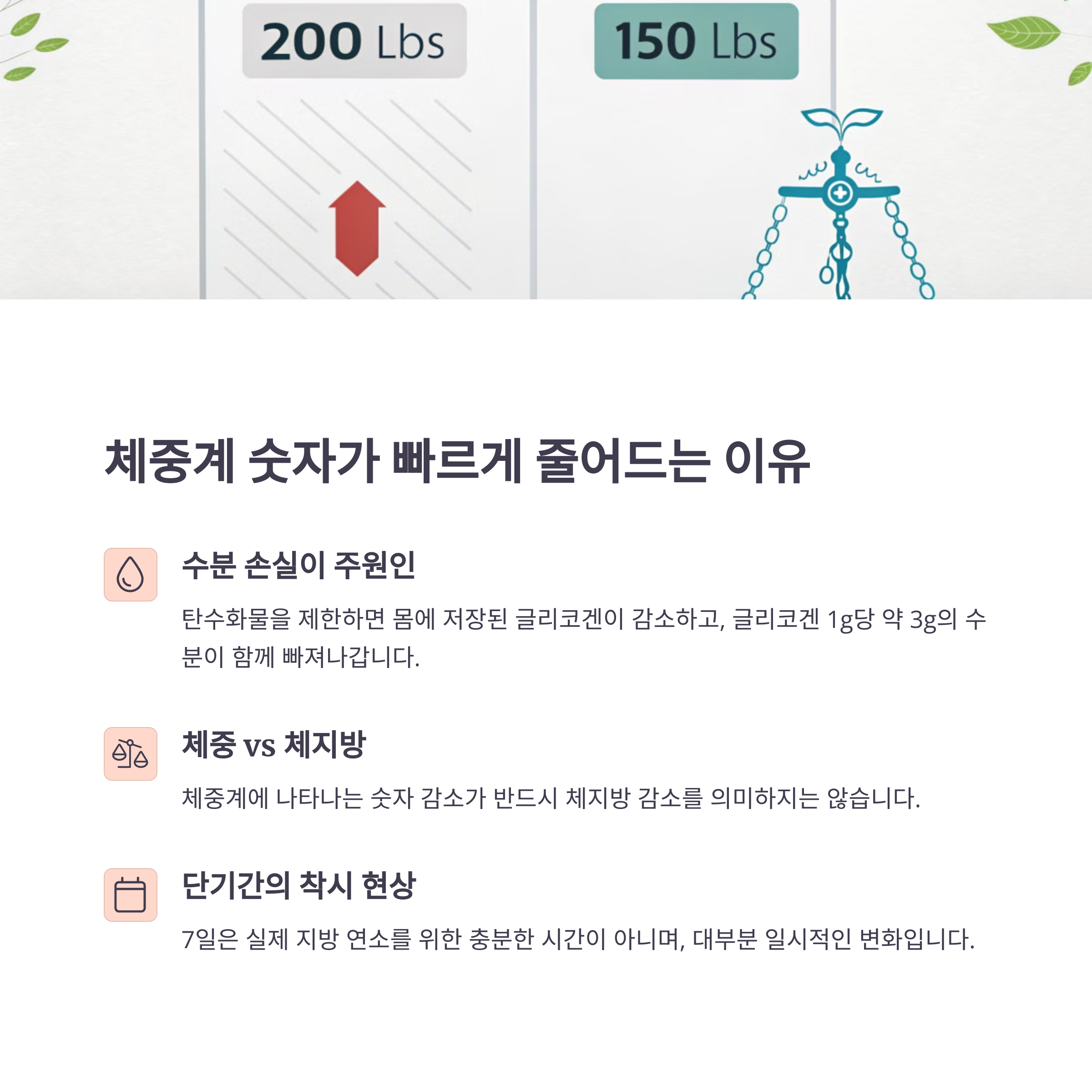 대부분은 수분 손실로 인한 체중 감소입니다. 체지방 감소 효과는 장기적인 식단과 운동 병행이 필요합니다.