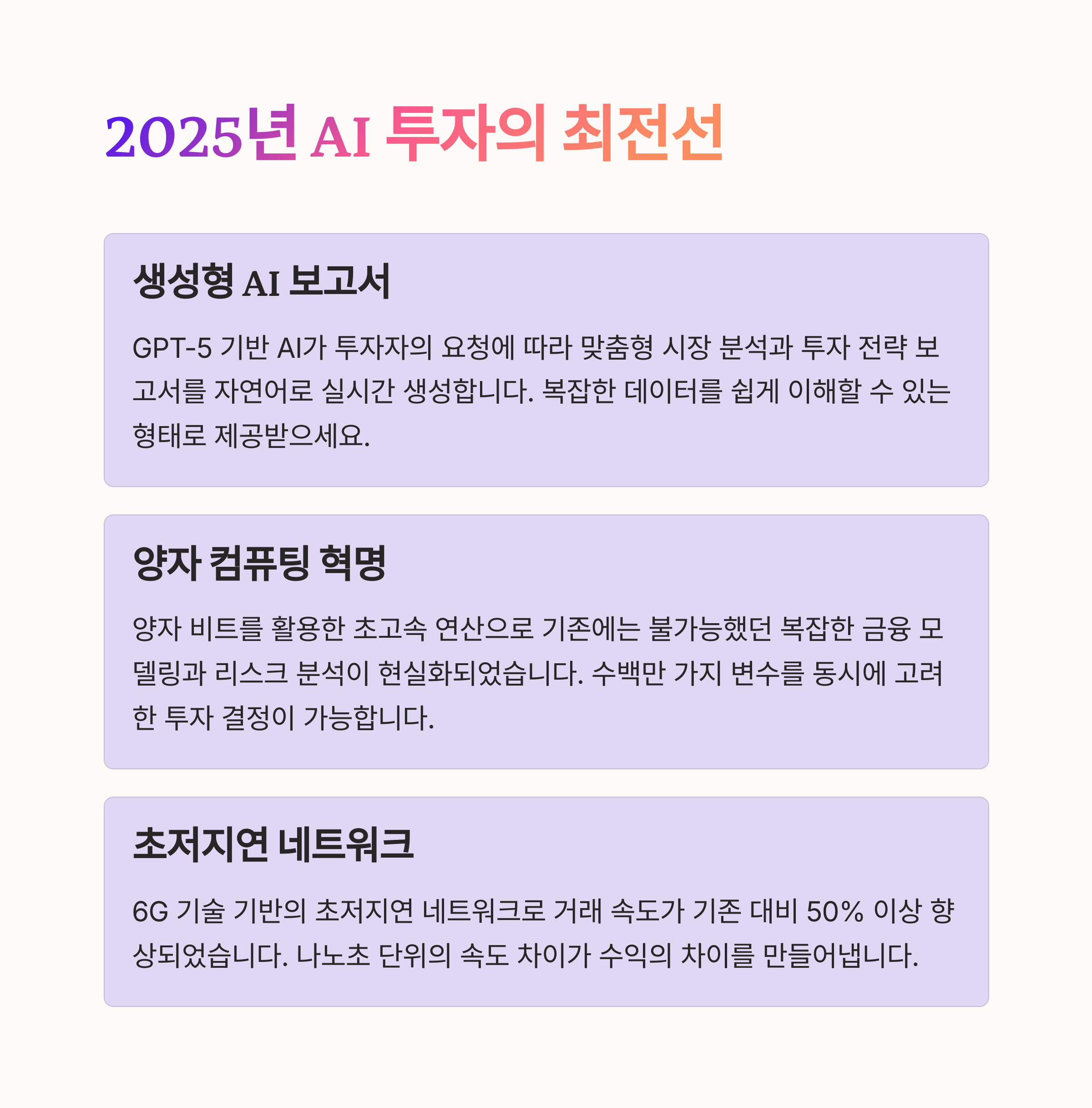 2025년에는 AI와 알고리즘 트레이딩이 더욱 통합된 형태로 진화하고 있습니다. 생성형 AI(GPT-5 등)를 활용해 자동으로 전략을 생성하거나, 양자 컴퓨팅 기반의 고속 분석 시스템이 도입되고 있습니다. 멀티에셋 트레이딩 시스템도 확장되며, 주식뿐만 아니라 외환, 채권, 원자재 등 다양한 자산군에서 활용이 증가하고 있습니다. 초저지연 네트워크 기술의 발전은 나노초 단위의 거래 속도를 가능하게 하고, AI는 실시간으로 시장을 학습하며 자동 매매 전략을 최적화하고 있습니다. 이처럼 기술과 금융의 융합은 투자자에게 더 높은 수준의 전략적 판단을 가능하게 해줍니다.