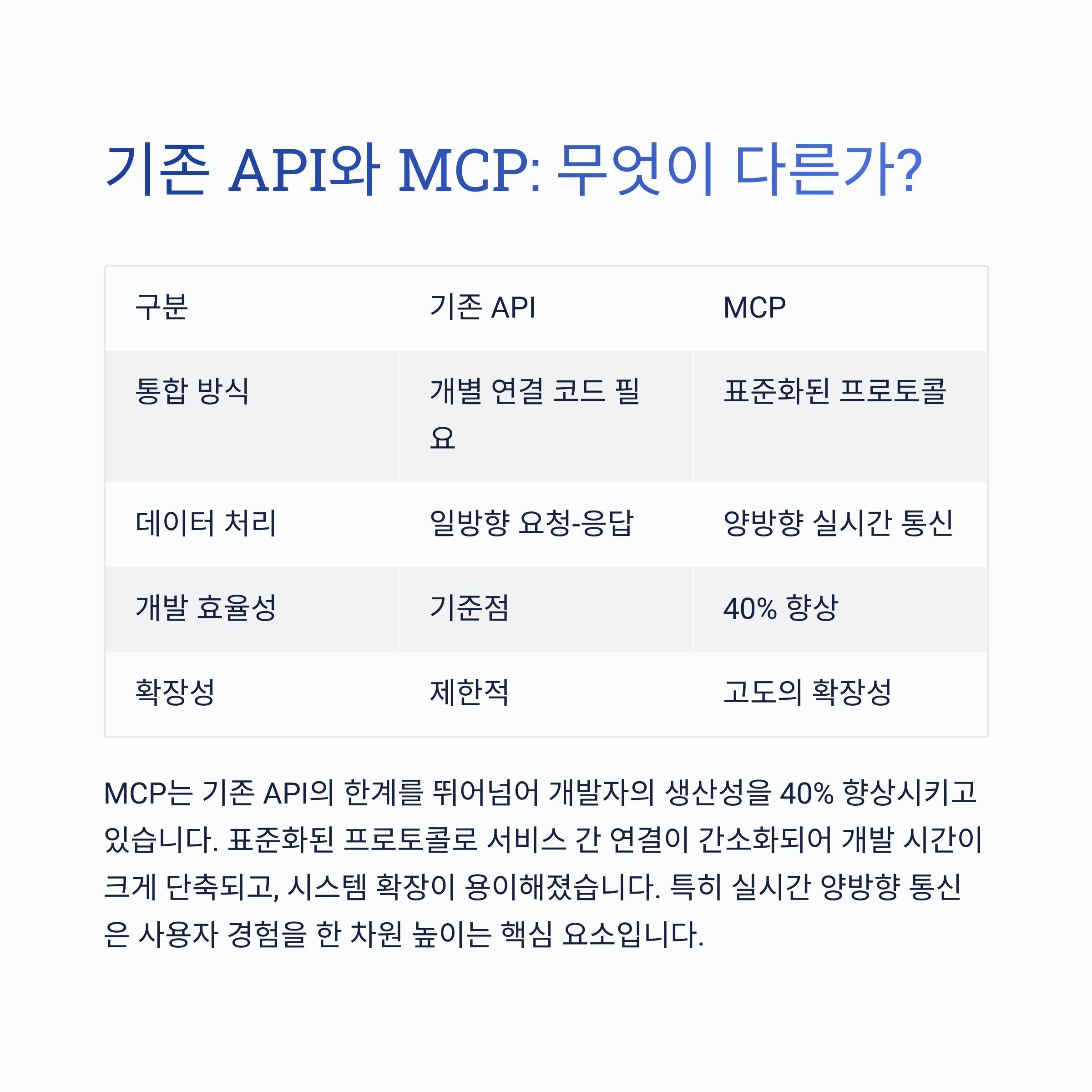 기존 API도 나름 잘 해왔잖아요? 근데 MCP는 차원이 달라요. 단일 프로토콜로 통합돼서 무수한 커넥션 관리할 필요도 없고, 실시간으로 데이터를 받아올 수 있고, 양방향 커뮤니케이션까지 가능하니까요. 아래 리스트를 보시면 차이가 딱 나와요.