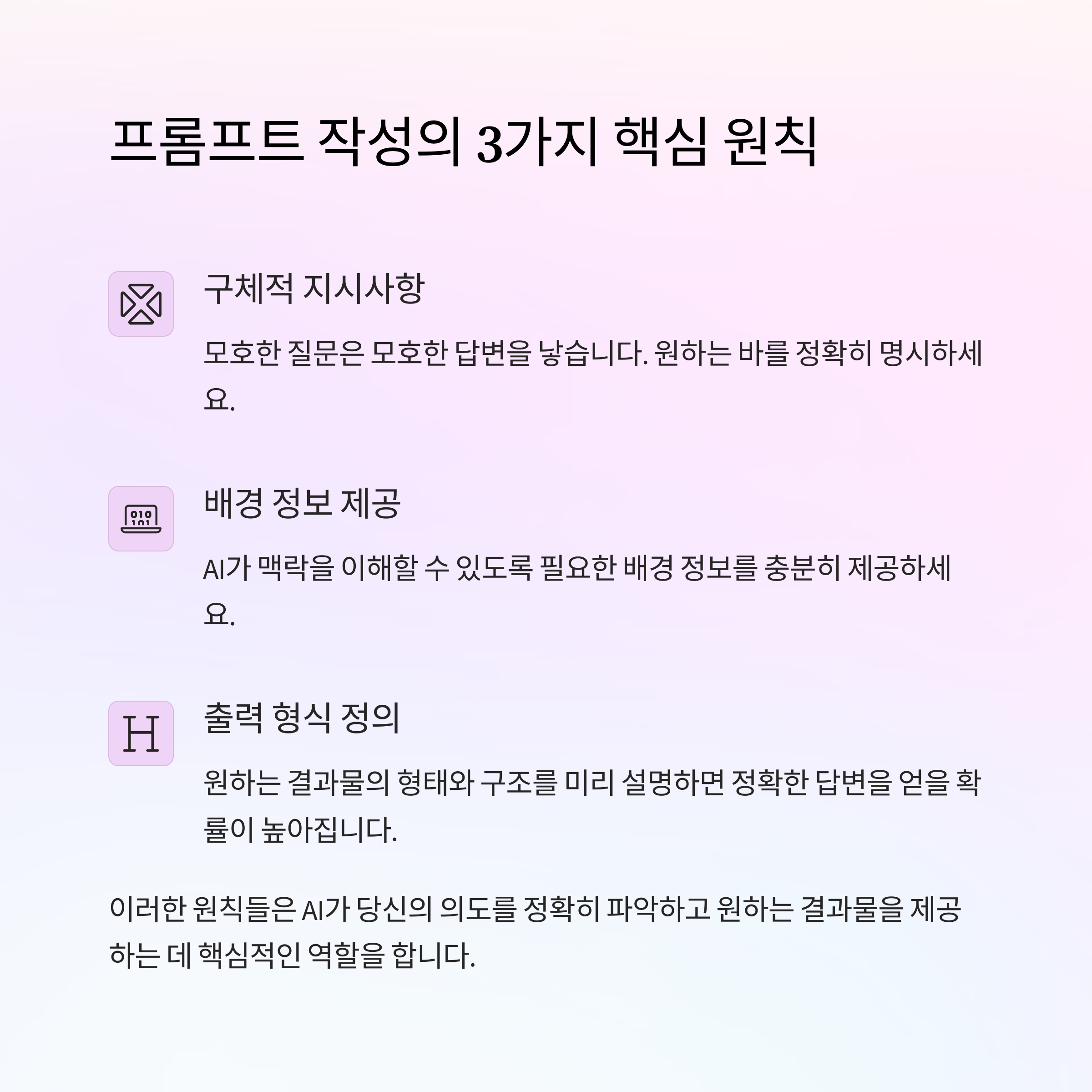 AI는 생각보다 맥락(Context)에 민감합니다. 대화의 배경, 대상 청중, 목표 등을 프롬프트에 포함시키면 더 자연스럽고 적절한 응답을 받을 수 있어요. 특히 톤(Tone)스타일을 명시해주면 응답의 뉘앙스까지 조정이 가능하죠.