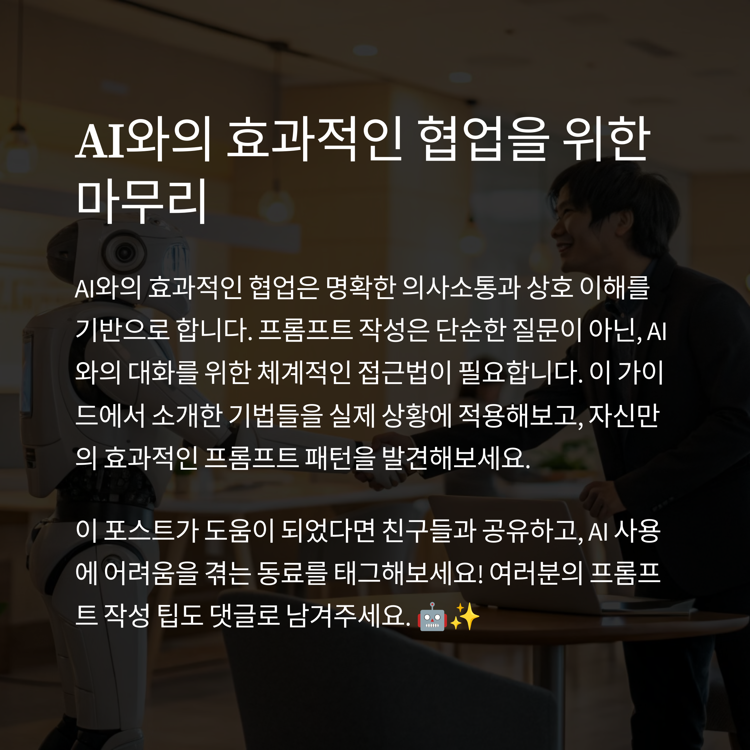 AI랑 대화하다가 막히는 순간, 이제 당황하지 마세요! 오늘 소개한 프롬프트 작성 꿀팁들을 잘 기억해두셨다가 필요할 때 하나씩 써보세요. 직접 해보면 확실히 달라진 응답 품질에 깜짝 놀라실 거예요. 앞으로도 GPT를 더 스마트하게 활용하고 싶은 분들이라면, 이 방법들 꼭 활용해보시길 추천드립니다. 여러분도 경험해보신 똑똑한 프롬프트 팁이 있다면 댓글로 공유해주세요! 🤗