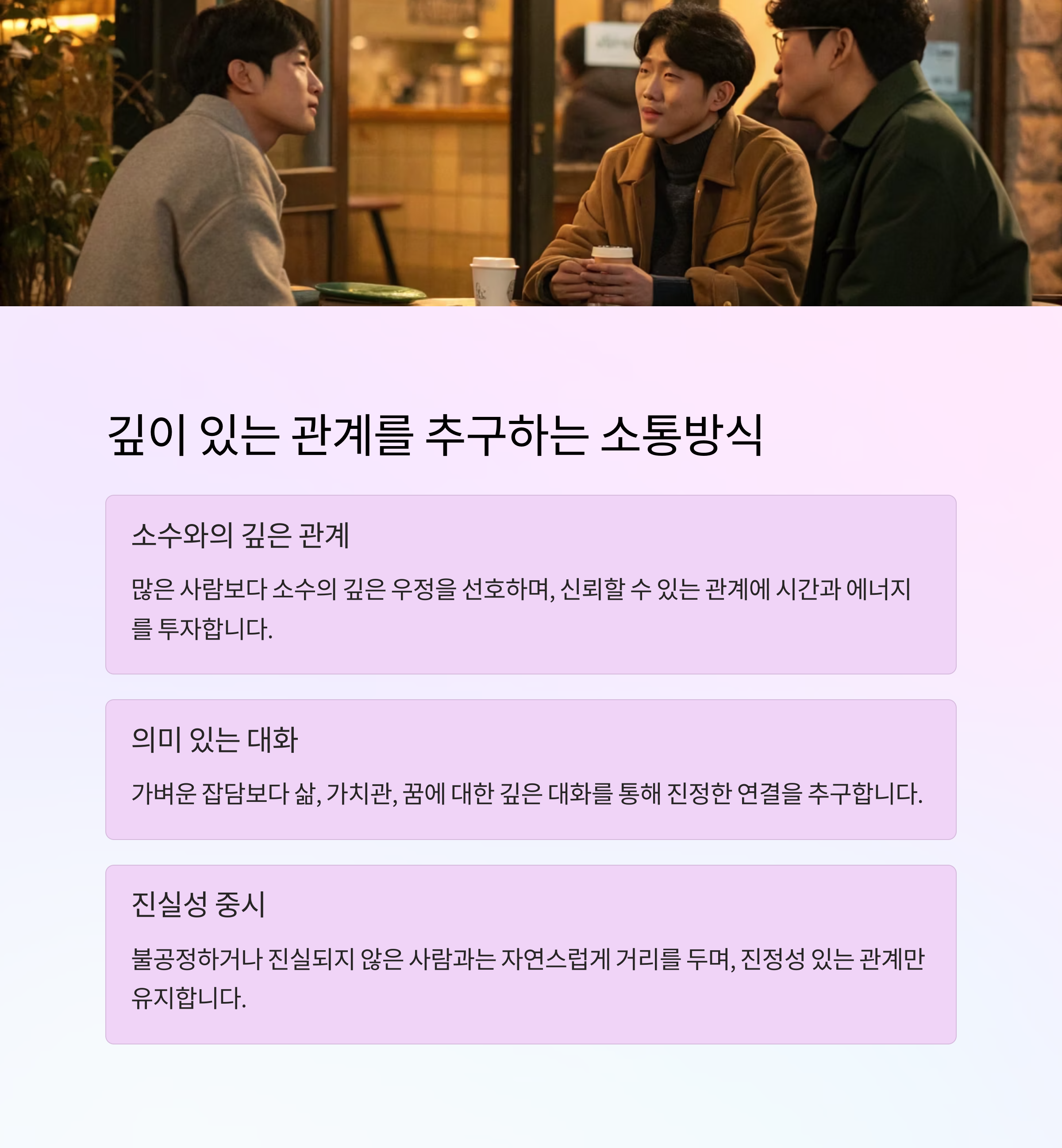그뿐만 아니라 작은 모임을 선호하며, 신뢰할 수 있는 관계 속에서 더욱 행복함을 느끼는 경우가 많습니다. 또한, 새로운 사람을 쉽게 받아들이기보다는 되도록 자신의 기준에 부합하는 사람과 관계를 쌓으려는 측면이 많죠.