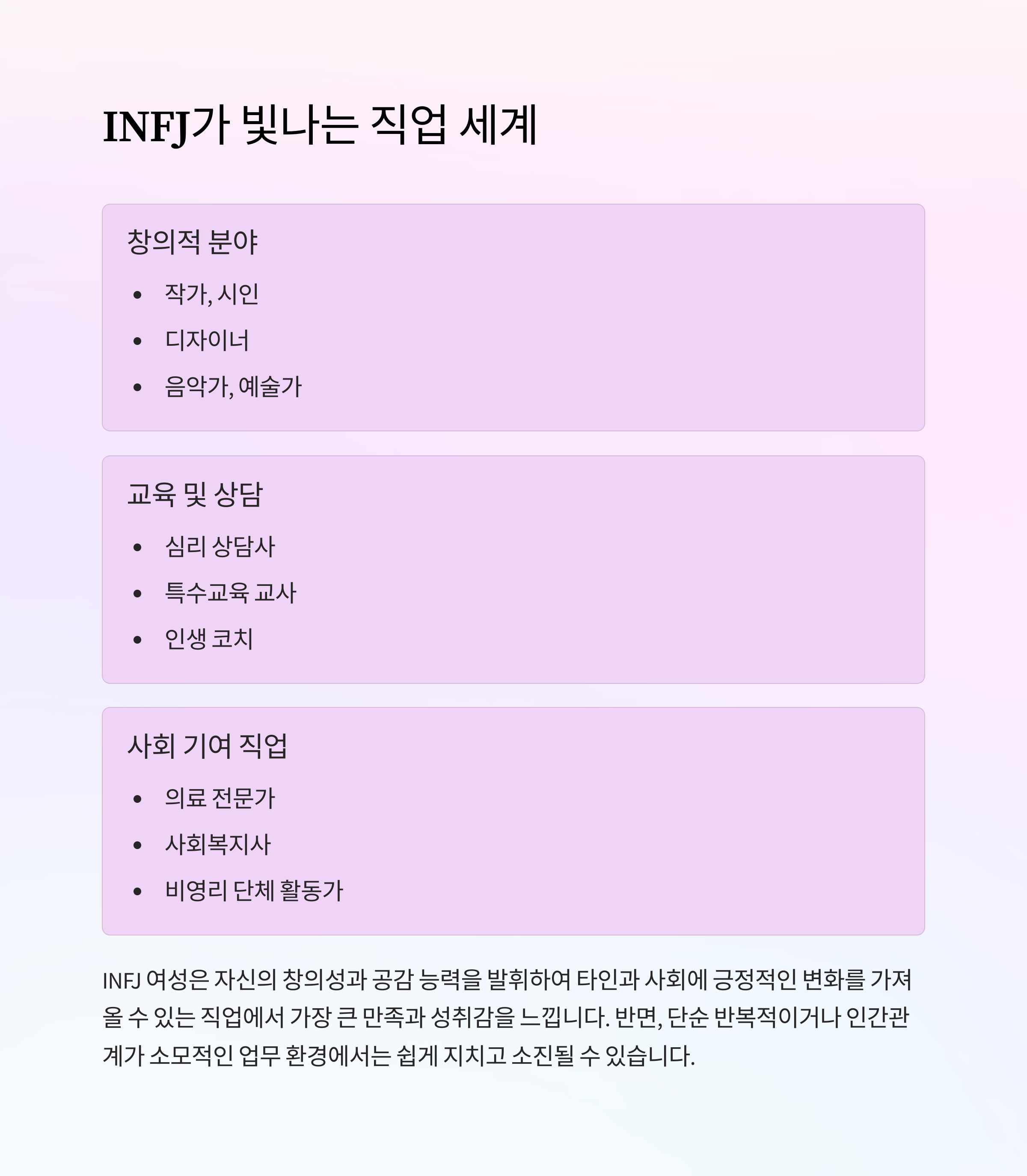 INFJ 여성은 직업 선택에 있어서도 본인의 가치관을 반영하려는 경향이 강합니다.