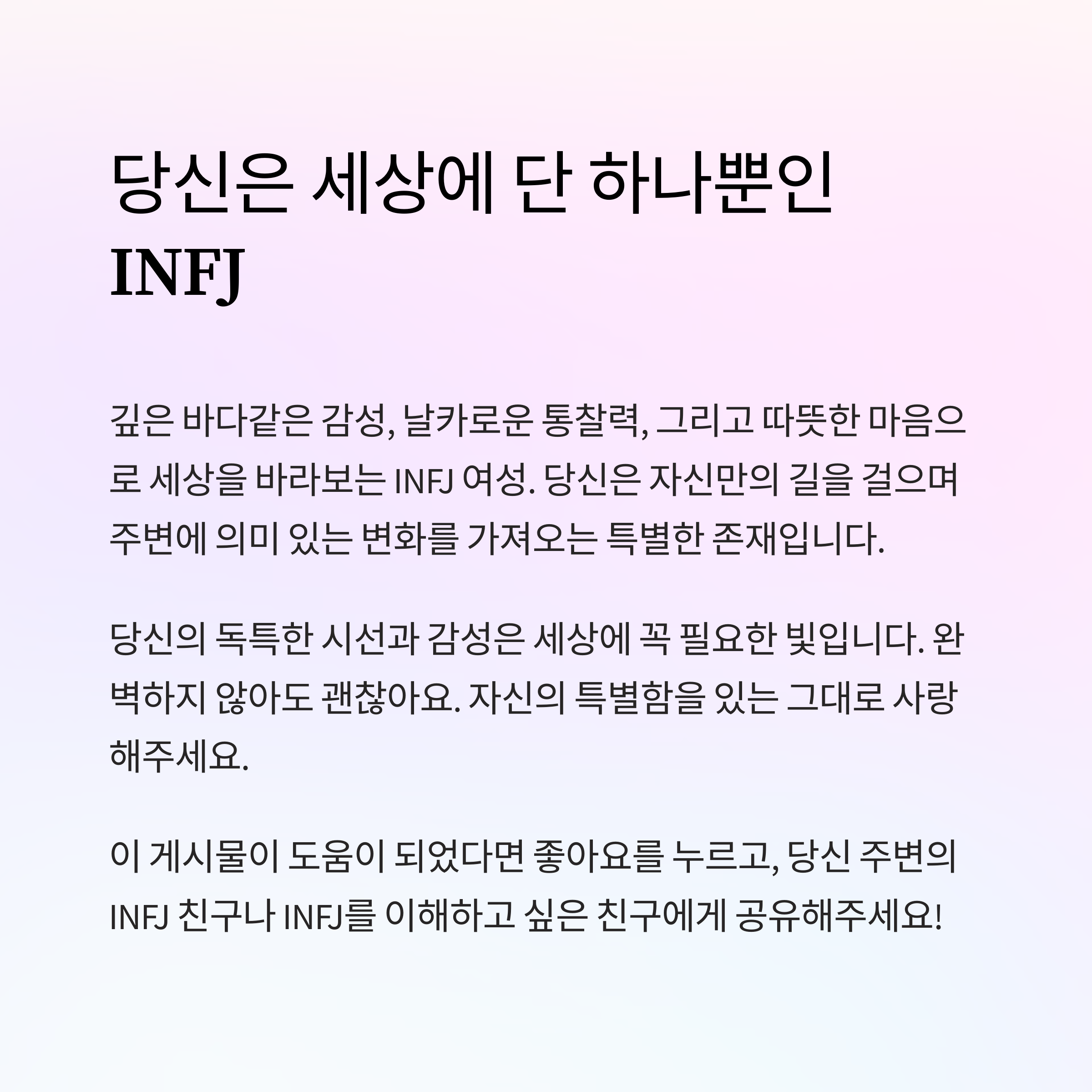 INFJ 여성은 본인만의 독특한 강점과 특징으로 빛나는 유형입니다.